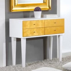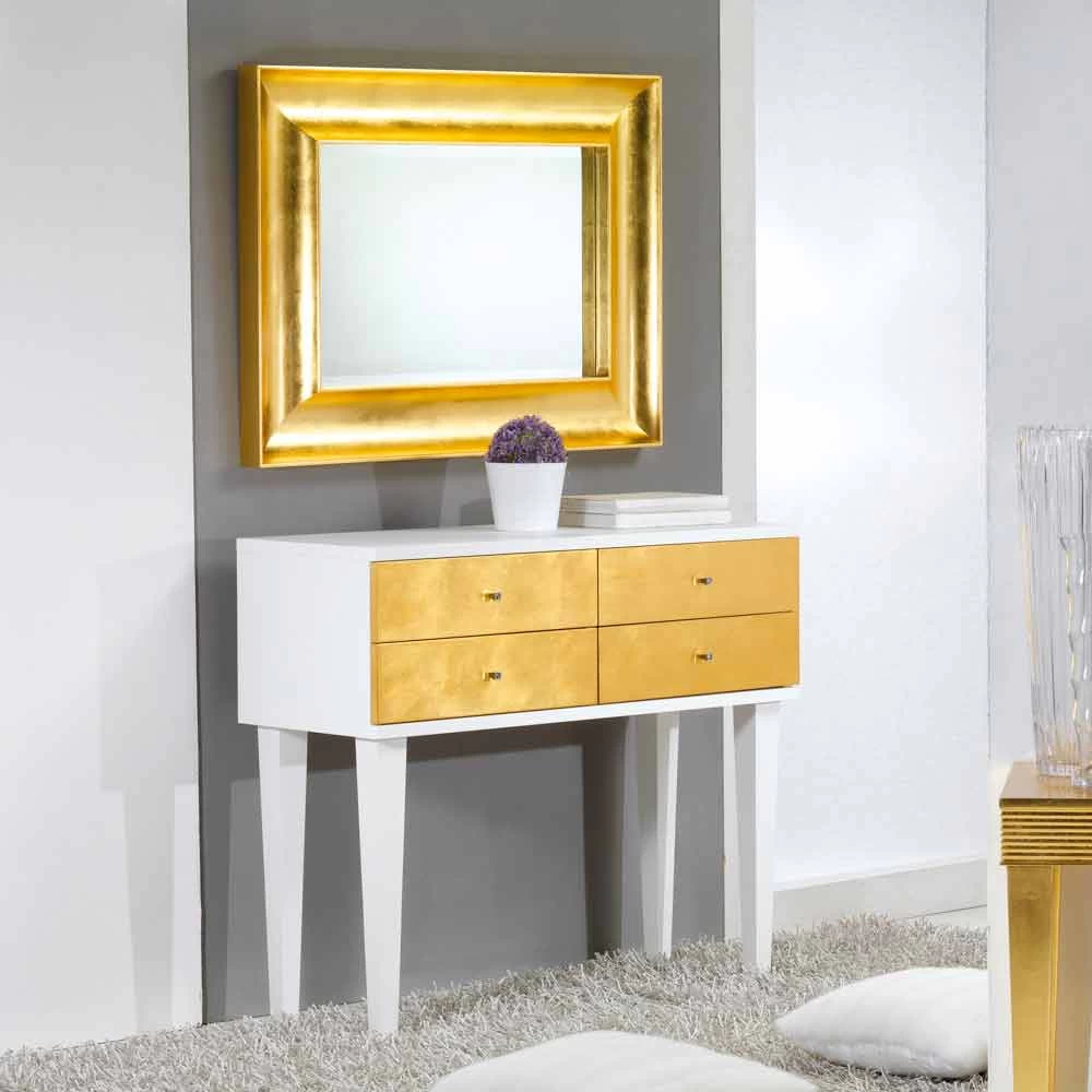 Paneles de cajón de madera con 4 cajones y perillas con cristales. acabado satinado blanco con cajones antiguos pan de oro. La artesanía hecha en Italia.