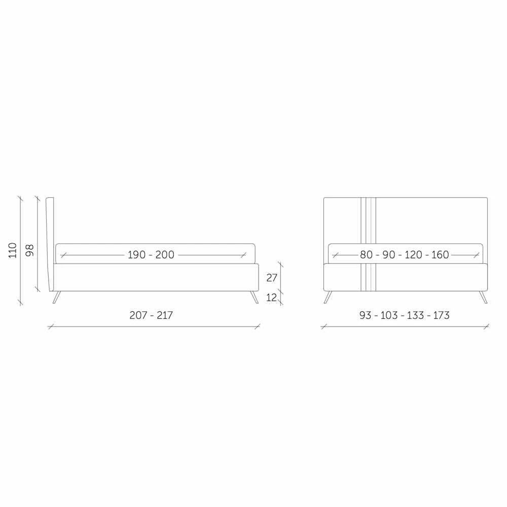 El cabecero y el marco de la cama están atravesados por dos rayas verticales y paralelas en tejido Stella Tex, colores 1 y 2. El cabecero no es extraíble, el marco de la cama es extraíble.