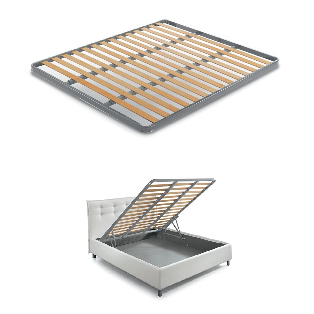 Esta cama está equipada con un gran contenedor con base elevable , que es la solución ideal para optimizar el espacio, manteniendo el dormitorio siempre ordenado. De hecho, dentro de la caja se pueden guardar mantas, ropa, almohadas, etc. El contenedor está equipado con una base elevadora ortopédica, fabricada en hierro tubular pintado con polvos epoxi a 200° y tiene dos barras de refuerzo de hierro verticales separadas y equidistantes. El tubular metálico mide 40×28 mm. Las lamas son enteras y de contrachapado de abedul de 68×8 mm.