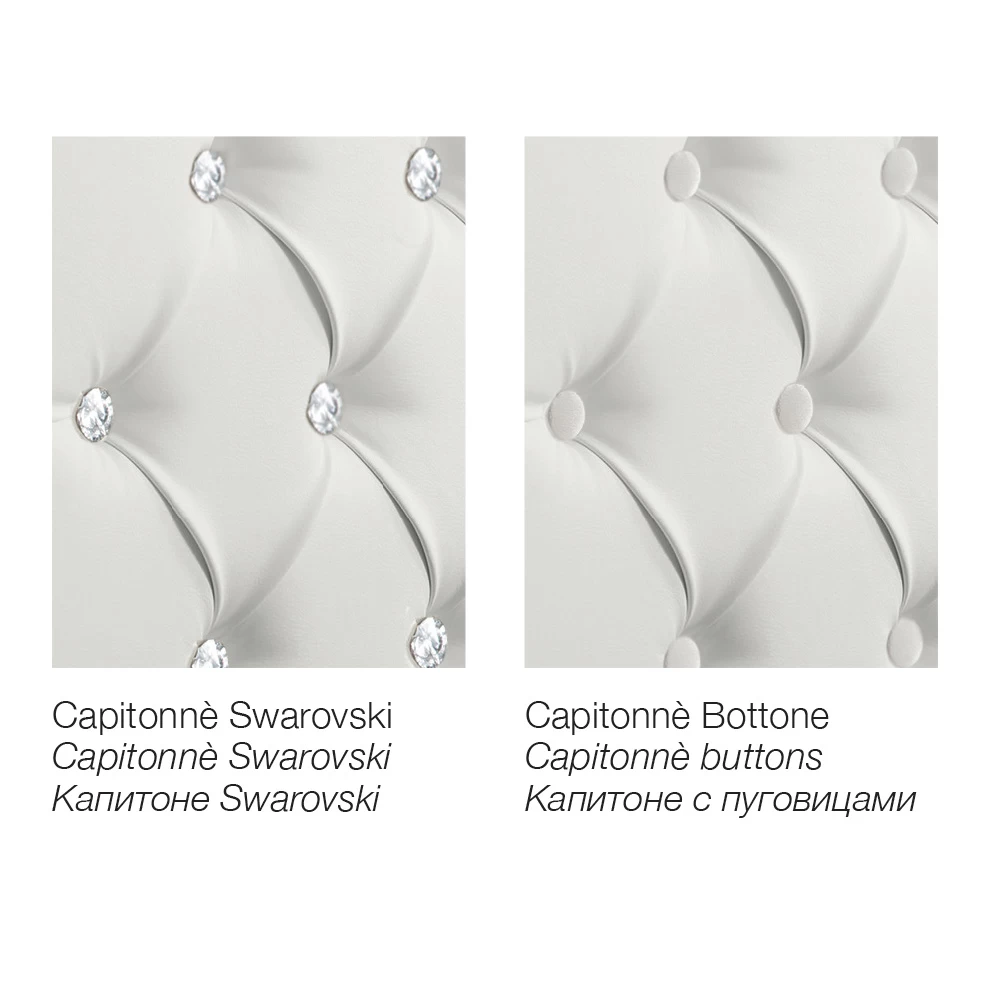 Realizada íntegramente a mano por maestros tapiceros , Ozzano es una cama cuya elaboración capitonnè realza la geometría perfecta del diseño en forma de diamante del cabecero, decorado con botones. En el interior, una robusta estructura de madera contrachapada de chopo con acolchado de poliuretano indeformable D30. Bajo pedido, el cabecero también se puede decorar con cristales Swarovksi . La estructura de la cama , de 32 cm de altura, tiene fundas desenfundables cómodamente . Dado el particular proceso de fabricación, el cabecero no se puede desmontar. Los pies estándar son de madera, de 6 cm de altura.
