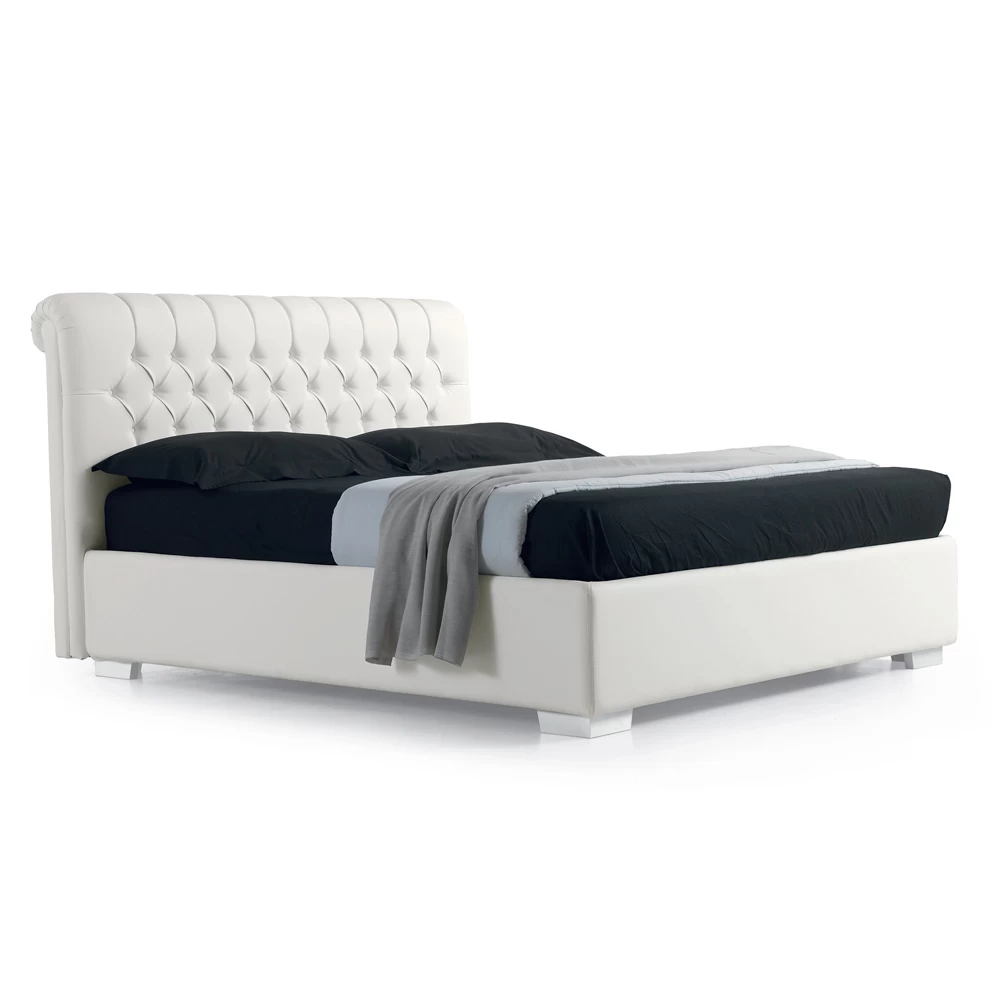 Cama doble tapizada revestida en ecopiel, con cajonera, made in Italy.