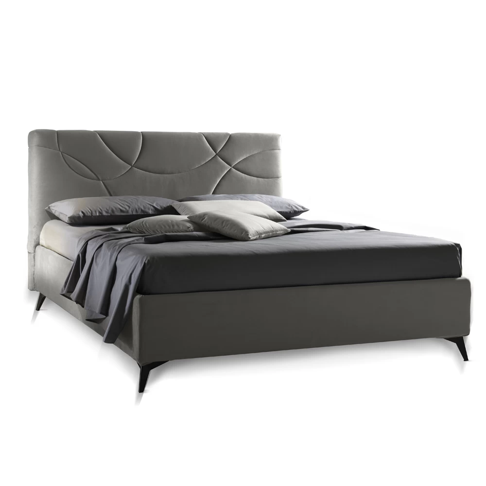 Cama de matrimonio totalmente made in Italy con somier tapizado completamente desenfundable y cabecero tapizado en tejido o terciopelo, base ortopédica de 160×190 cm y pies de metal acabado moka (h. 13,5 cm). Una solución de decoración que responde a cada necesidad ofreciendo el máximo confort junto con un diseño esencial y elegante .