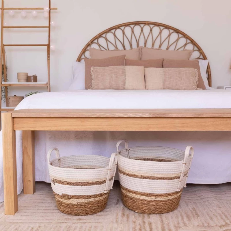 Cesto fabricado en fibras naturales disponible en tres tamaños diferentes a elegir. Podrás almacenar mantas en el salón, cojines u ordenar los juguetes de los más peques. Aportarán gran funcionalidad y una sensación de luz y calidez característico del estilo nórdico. ¡Elige tu tamaño!