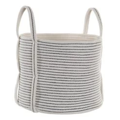 Cesto con asas fabricado en algodón de color blanco con rayas negras. Un cesto para organizar tus objetos y potenciar tu decoración. Ideal para estancias de estilo nórdico y para guardar los juguetes de los peques.