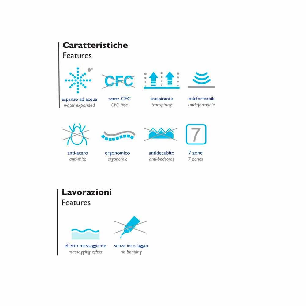 La mejor transpirabilidad también está garantizada por el perfil particular y de los agujeros que se unen la Memoria a la capa de espuma de «Nature» que apoya en un peso corporal adecuado y eficaz, esto también forma en la parte inferior para facilitar el uso de este producto en las redes mecanizada.
