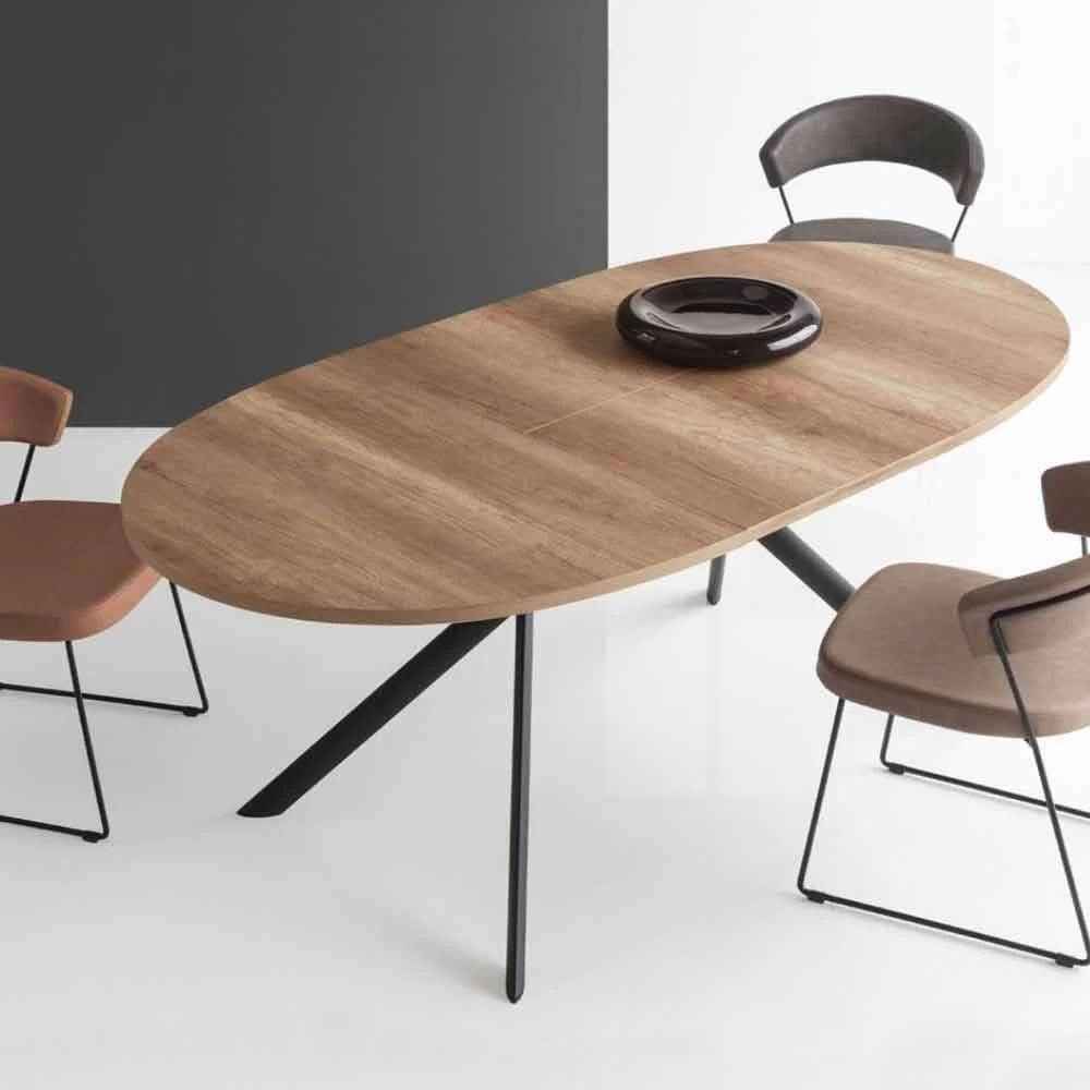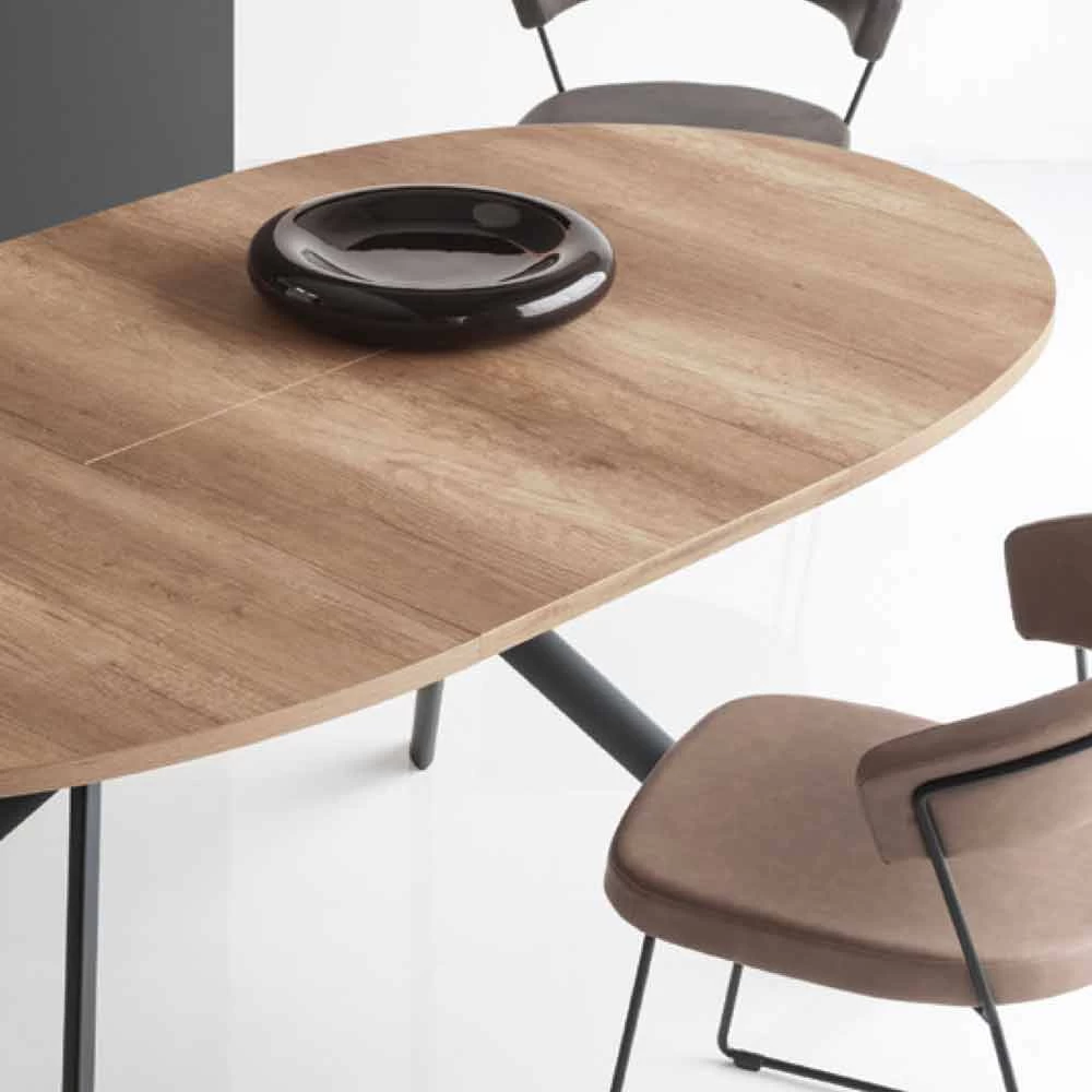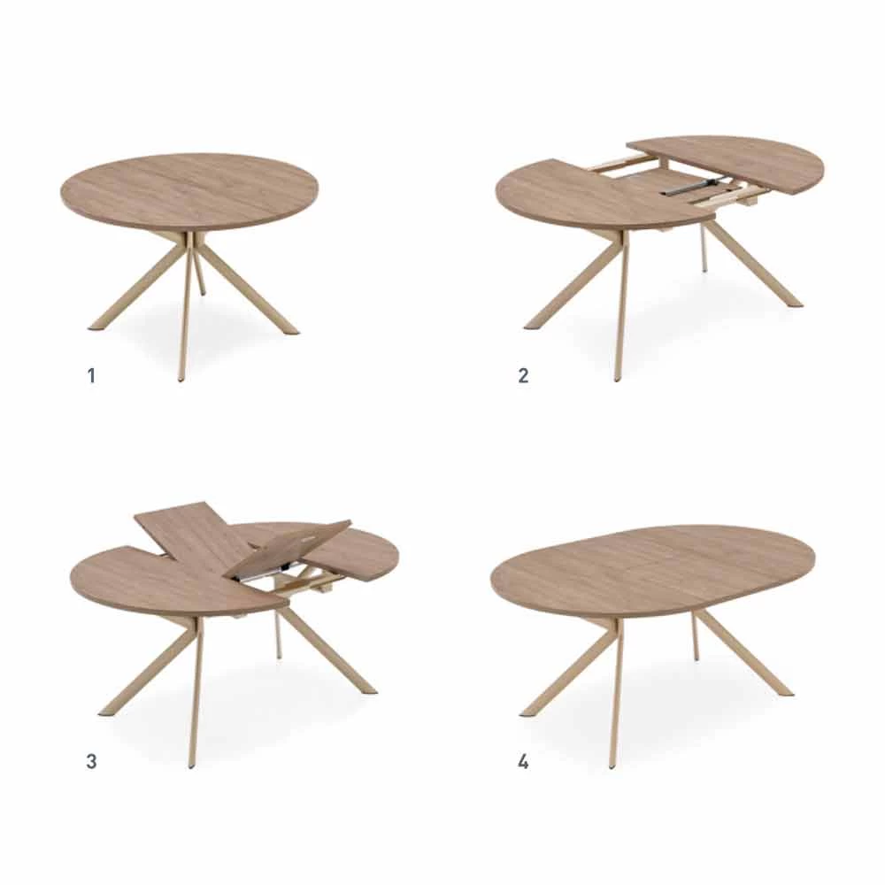 mesa extensible Júpiter, base metálica con tapa redonda en melamina de la vendimia. base central en un metal fijo con cuatro patas inclinadas elíptica en sección transversal y el mecanismo de apertura de libros con extensión central en tinte con la base. Las líneas simples y decidieron que sea adecuado para cualquier espacio de vida.