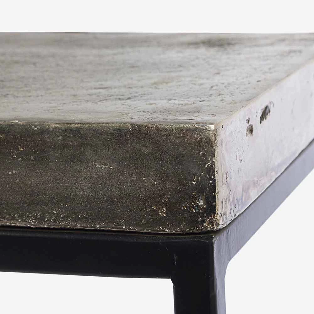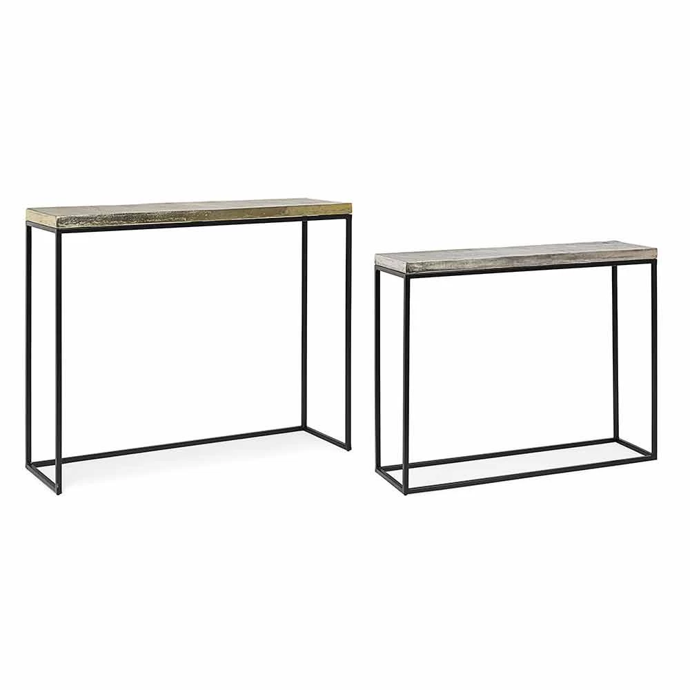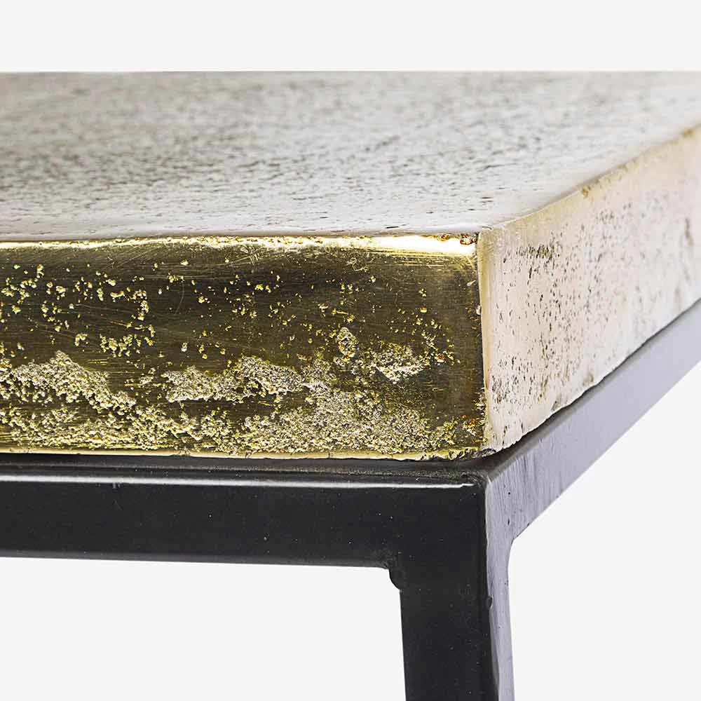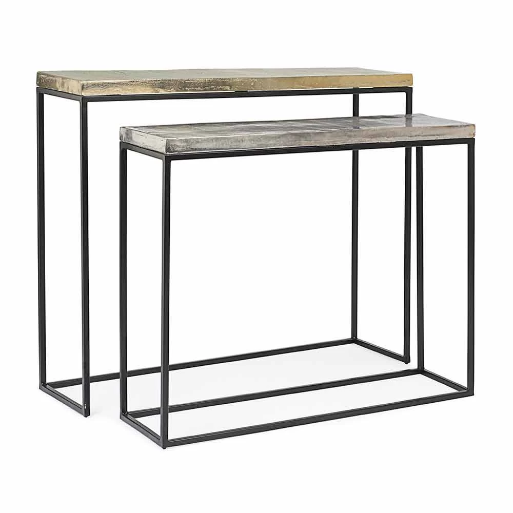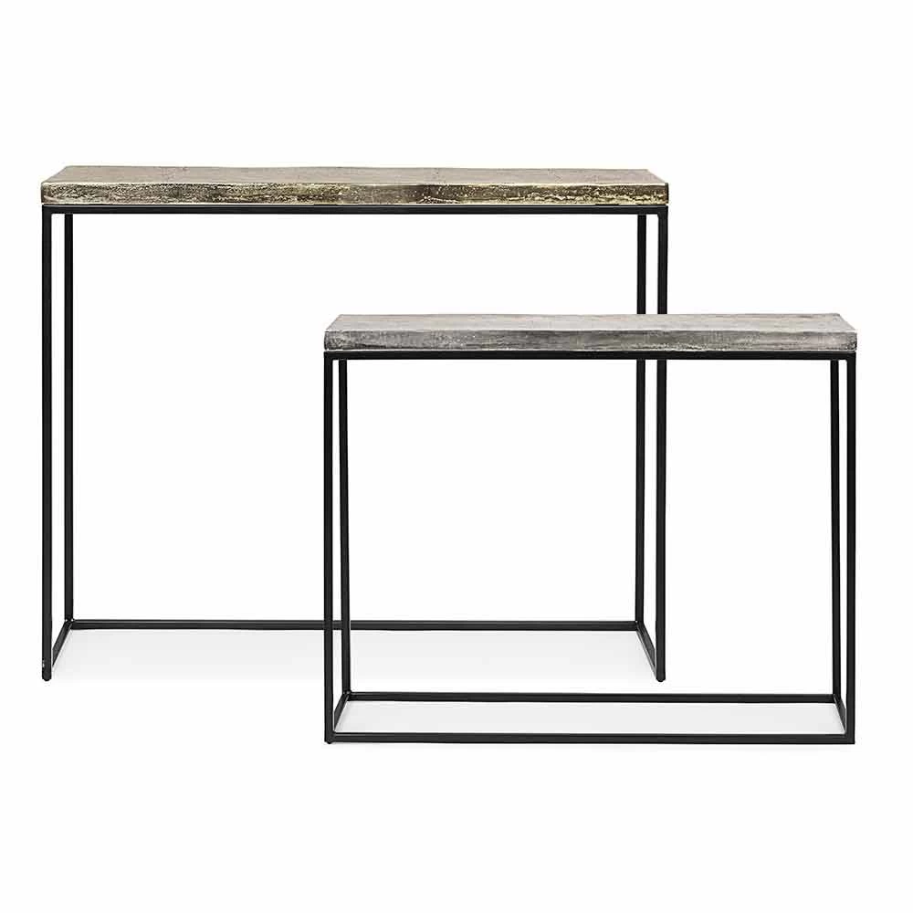 Este par de consolas de diseño tiene una estructura de acero con recubrimiento de polvo epoxi y una tapa de aluminio con un acabado chapado y envejecido.