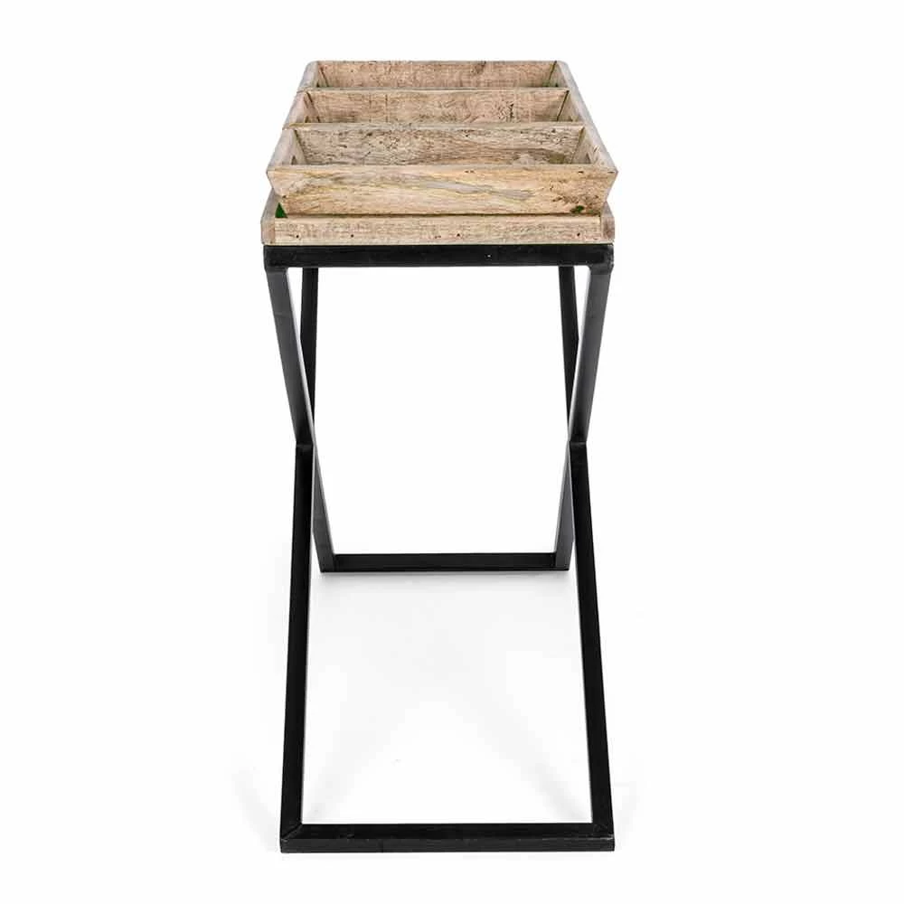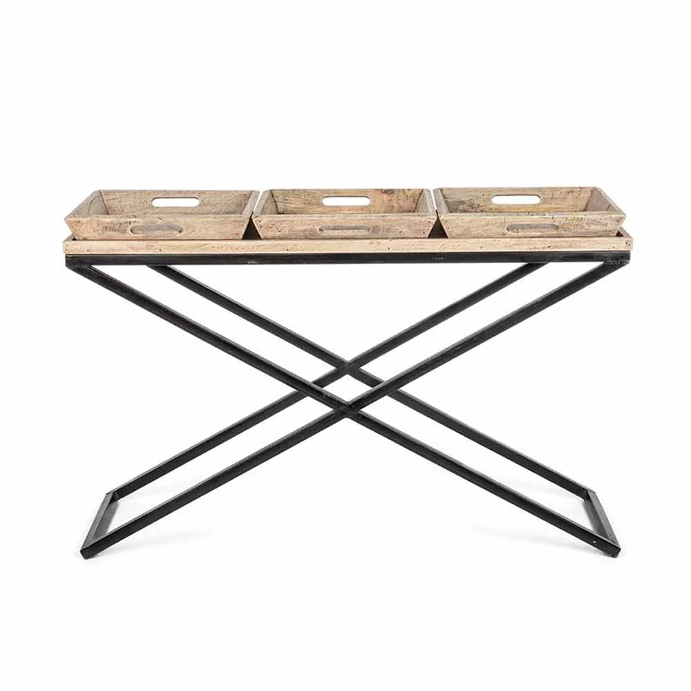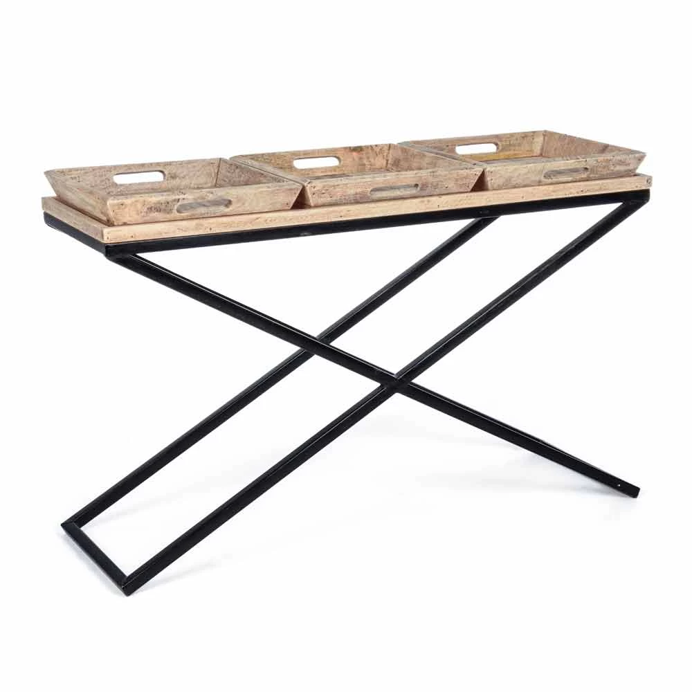 Mesa consola moderna de estilo industrial con estructura en cruz de acero y tapa de madera de mango con 3 bandejas.