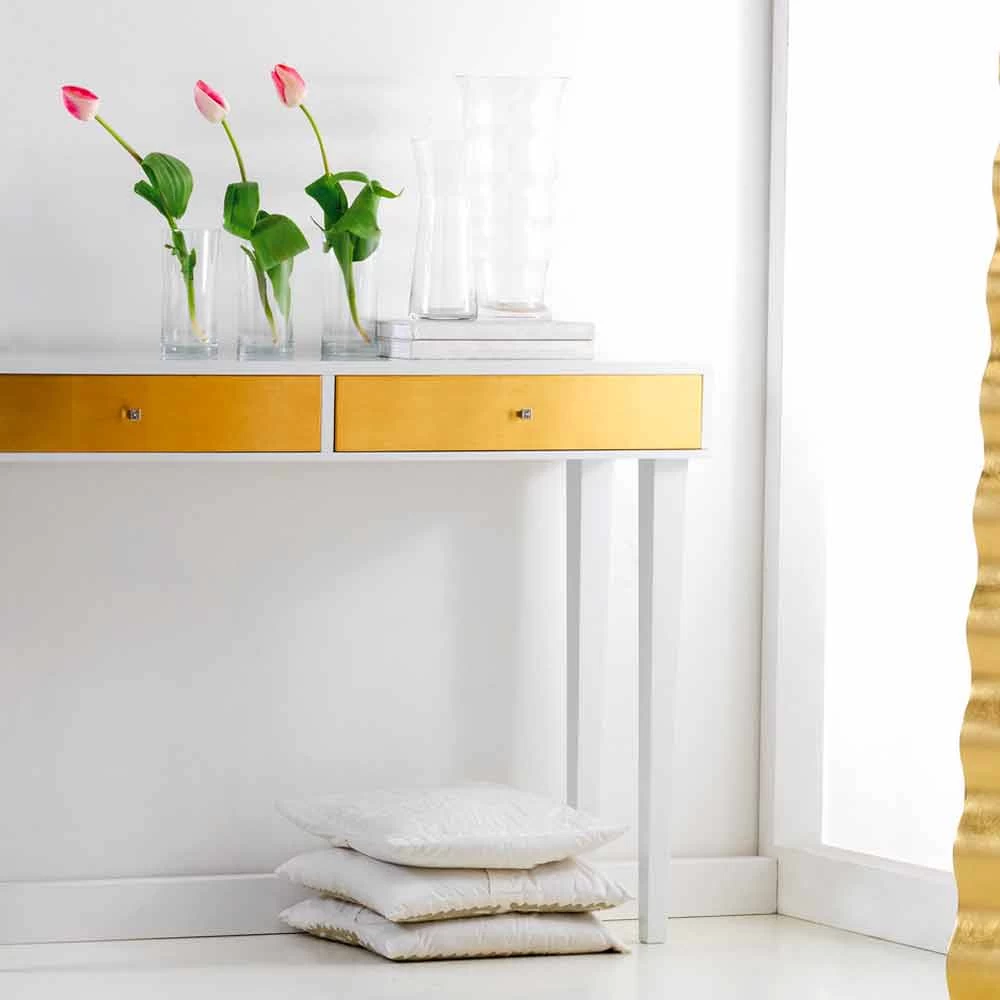 Beel es una consola moderna totalmente realizados en Italia. La estructura tiene un acabado blanco lacado brillante, mientras que los cajones tienen acabado en pan de oro. Las perillas de los cajones están decoradas con cristales de Swarovski. La artesanía por completo.