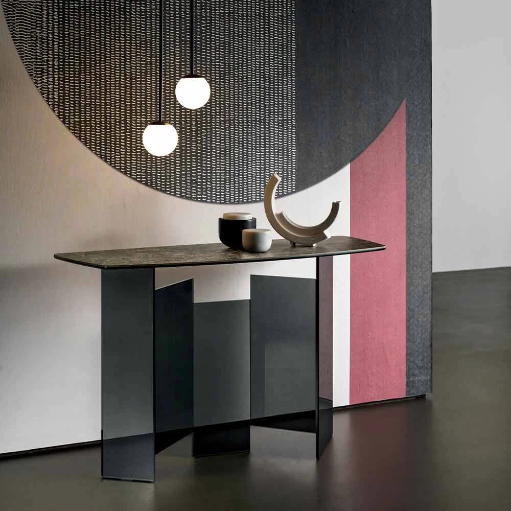 Consola para sala de estar de diseño moderno en cerámica Emperador o Noir Desir y base de vidrio, realizada a mano en Italia.