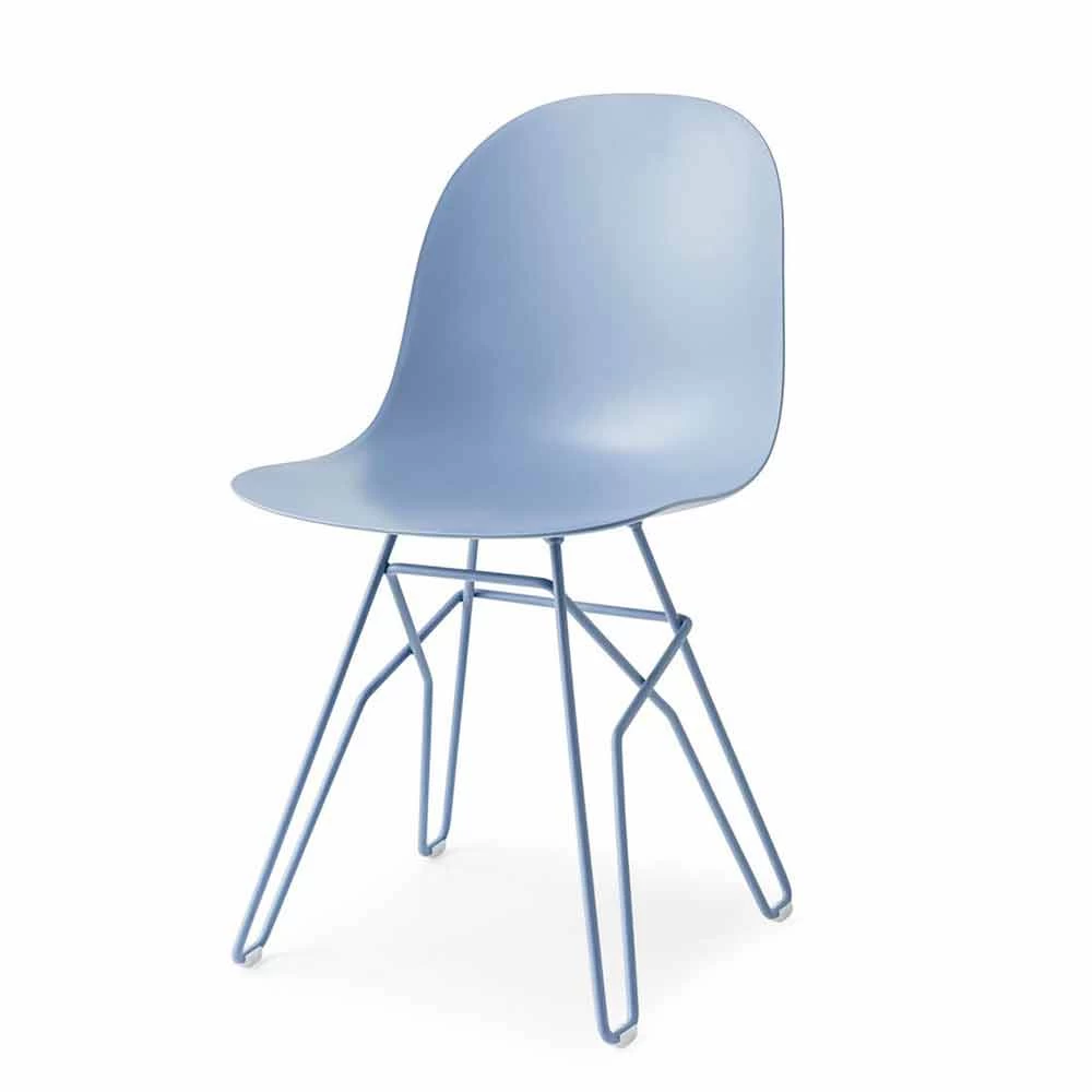 modelo Academia Silla con cáscara hecha de polipropileno (polimerocomposito estructural con carga mineral) impreso en co-inyección con 35% de material reciclado. La forma del asiento es una búsqueda de formas simples y sinuosas adecuados para cualquier ambiente y situación. Estructura en metal varilla trenzada.