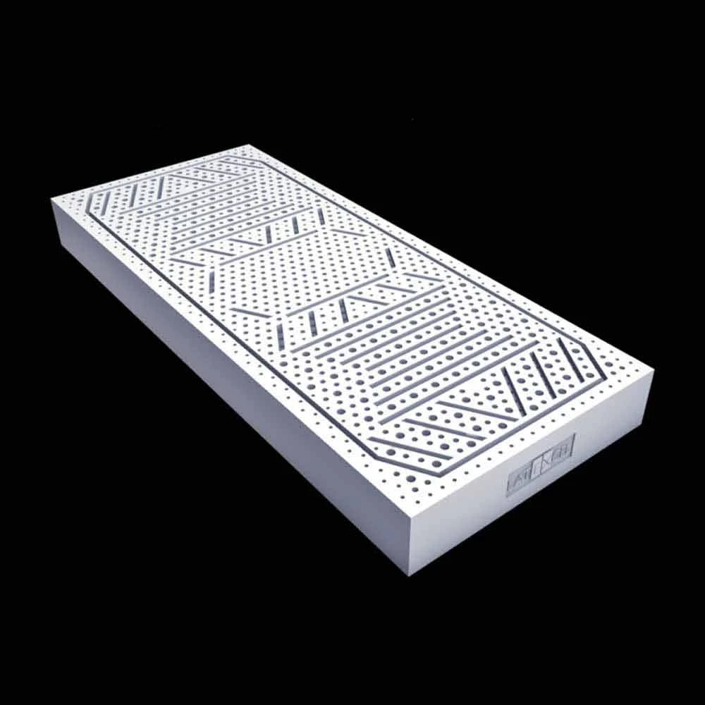 Una hoja de 100% de látex natural, una estructura de nido de abeja, que se inspira en la columna vertebral, aceptar y soportar el cuerpo en descanso gracias a 7 áreas diferentes de importancia, favorecida por el efecto de las almohadillas de masaje y los agujeros en las especies de superficie multidiámetro lugares en ambos lados de la placa.
