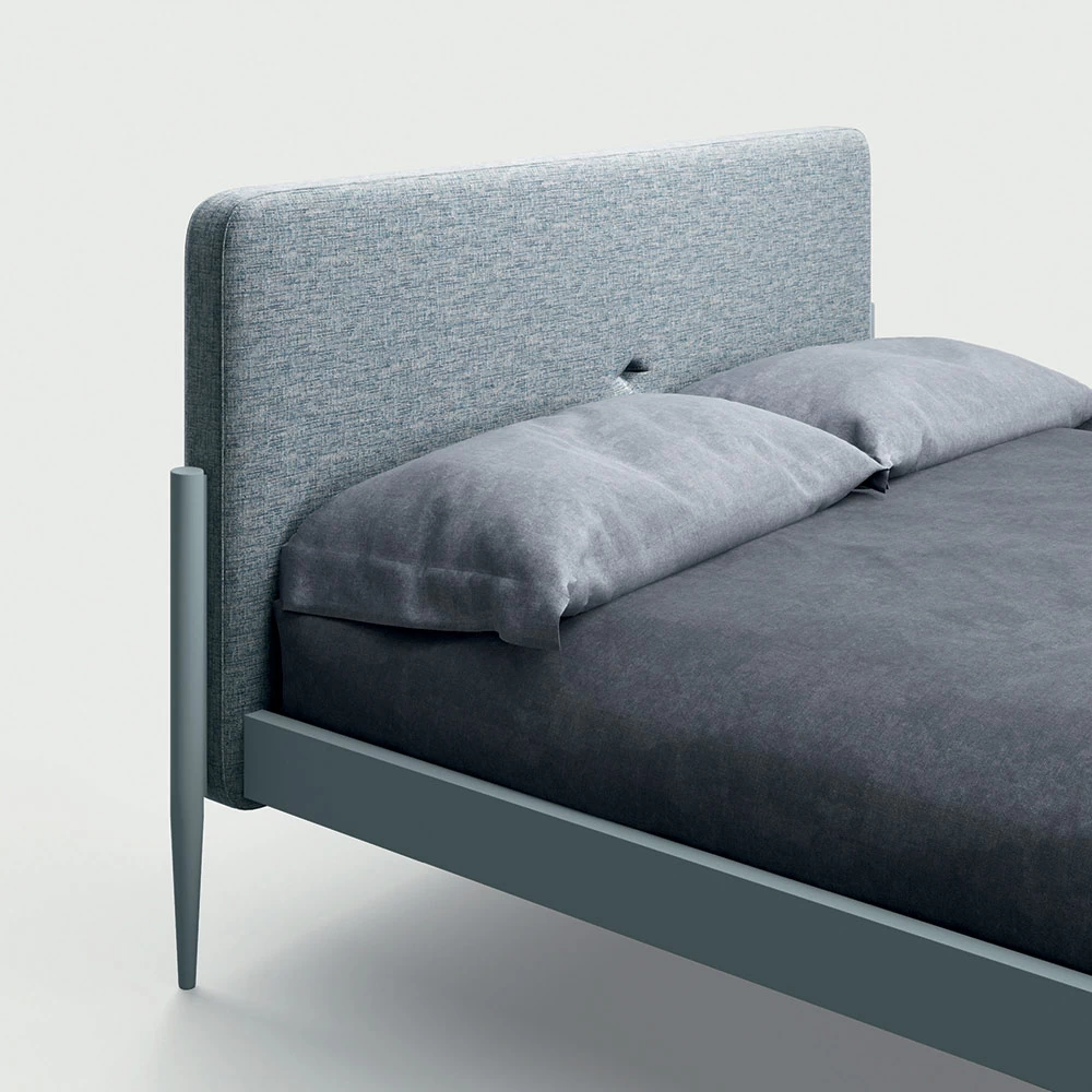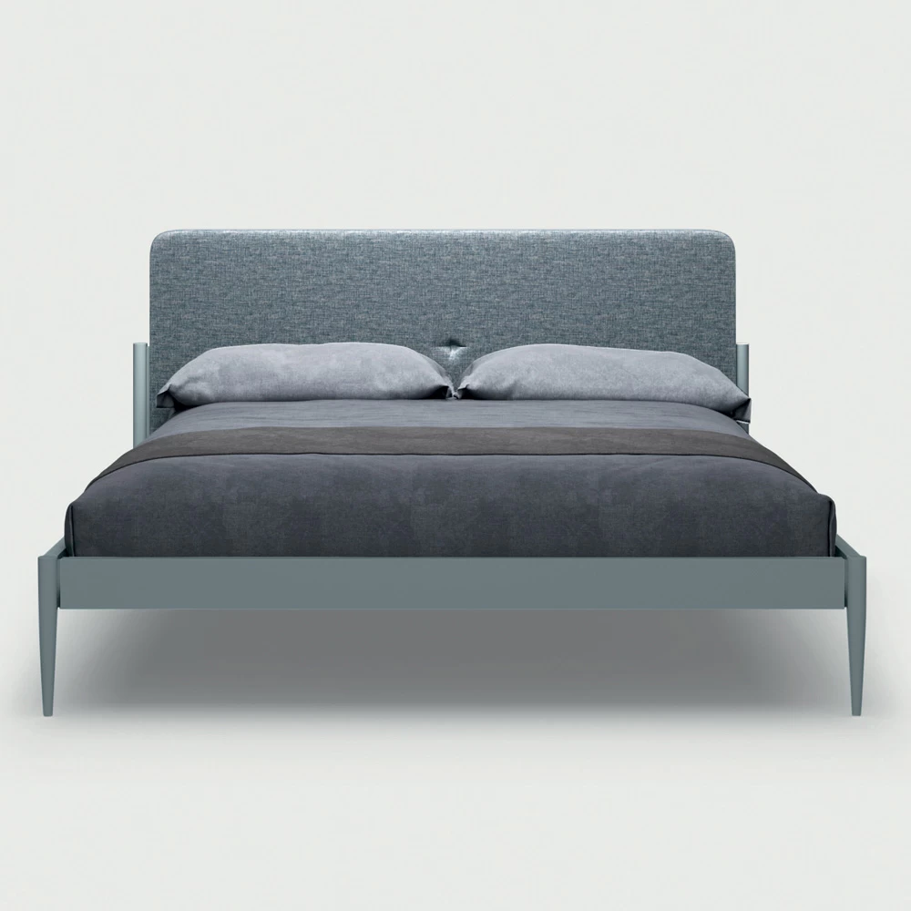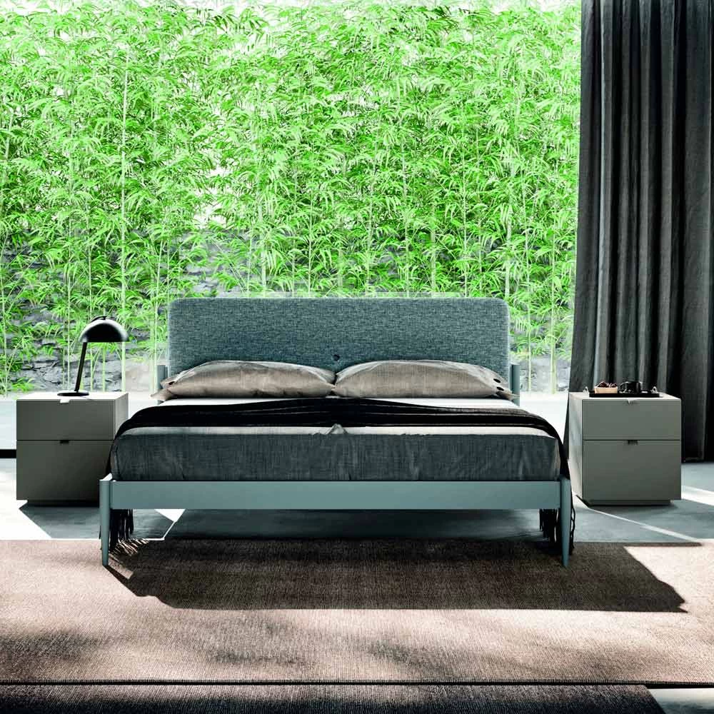 Dormitorio completo compuesto por 4 elementos íntegramente made in Italy . La composición incluye una cama doble con bastidor de la cama y los pies en mate niebla lacado de madera y la cabecera cubierta de tela, 2 mesitas de noche con 2 cajones cada uno y una cómoda con 4 cajones en madera de titanio laqueado mate recubierta de cuero acabado antracita con asas que emparejan . La cama, protagonista de la habitación, representa una idea de mobiliario que surge de la reelaboración contemporánea de un gusto retro mediante el uso de accesorios de líneas suaves y esenciales que enriquecen el ambiente de dormir con una comodidad y una acogida pertenecientes a un estilo típico. del pasado. Dar un toque contemporáneo al espacio es la opción de combinar el cuero con los demás materiales utilizados, aportando así una estética original y creando una armonía única dentro de los espacios privados.