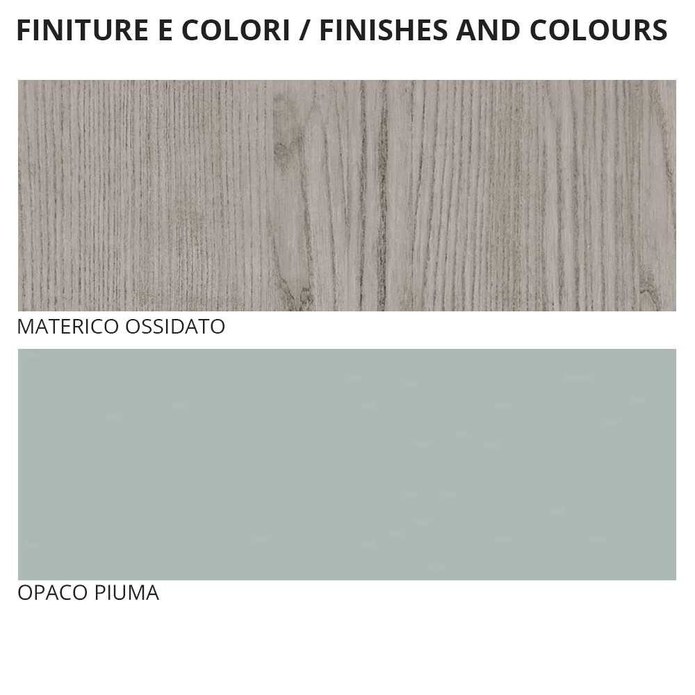 Dormitorio doble con 4 elementos totalmente fabricado en Italia . La composición incluye una cama de matrimonio con cabecero y estructura de cama en madera con acabado material oxidado y pies en metal bruñido , 2 mesitas de noche de 2 cajones cada una y una cómoda alta de 6 cajones en madera con acabado material oxidado y lacado pluma mate. La cama se convierte en protagonista del mobiliario gracias a su grandiosidad y su diseño que reelabora en clave contemporánea una referencia al gusto retro caracterizado por una combinación perfecta de accesorios ligeramente redondeados que dan vida a una comodidad y una acogida que pertenecen a un pasado estilo. La particular configuración que enriquece los frontales de las mesitas de noche y de la cómoda permite que la estancia adquiera aún más autenticidad gracias a un original juego de contrastes con diferentes colores y acabados.