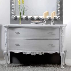 Tocador de estilo provenzal con 2 cajones de madera maciza. Las asas están decorados con cristales. Hechos a mano, antigüedades acabado lacado blanco con decoración de hojas de plata. Made in Italy. También disponible en otras decoraciones de laca y oro.