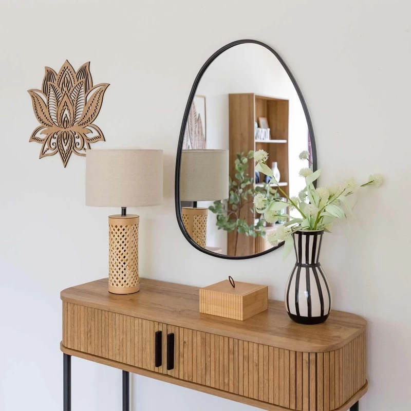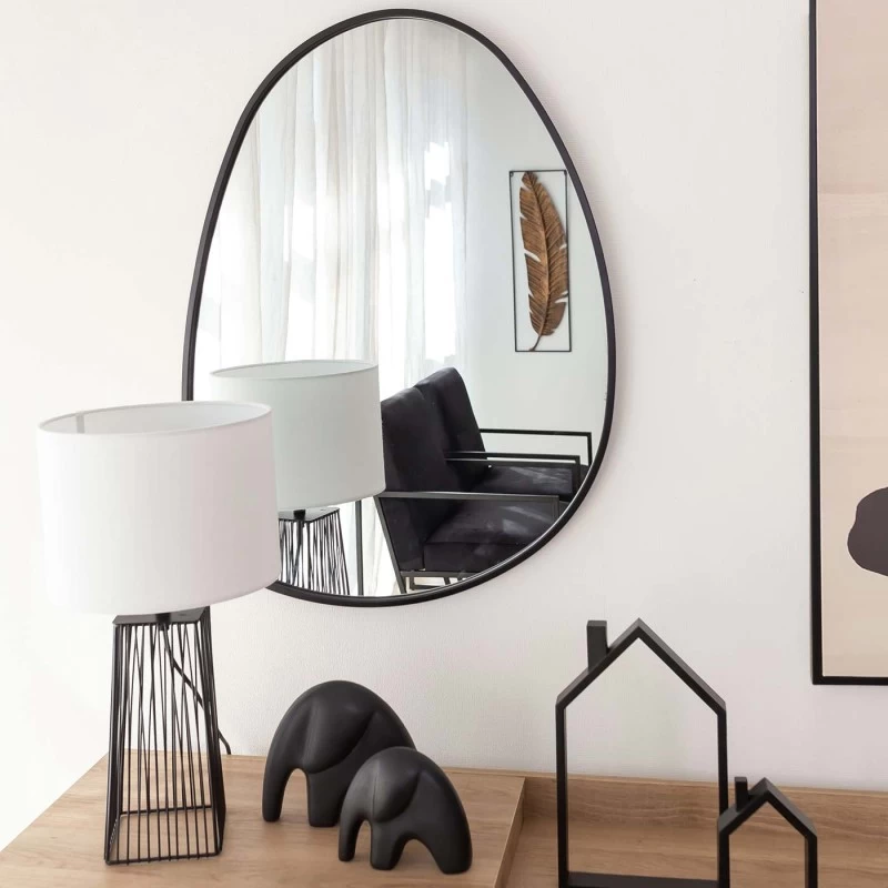 Espejo de pared fabricado en metal de color negro. Los espejos asimétricos son tendencia por sus formas orgánicas y líneas desenfadadas. El espejo Carmelo es el accesorio perfecto para darle a tu recibidor, dormitorio o salón un toque moderno.