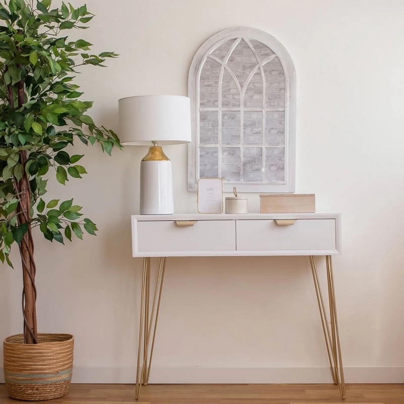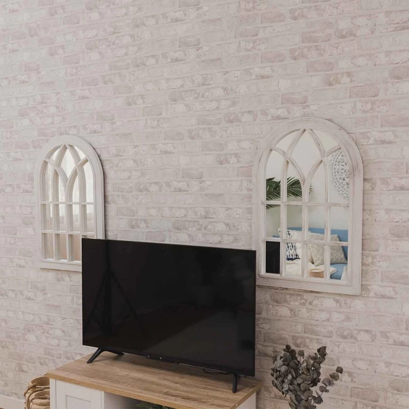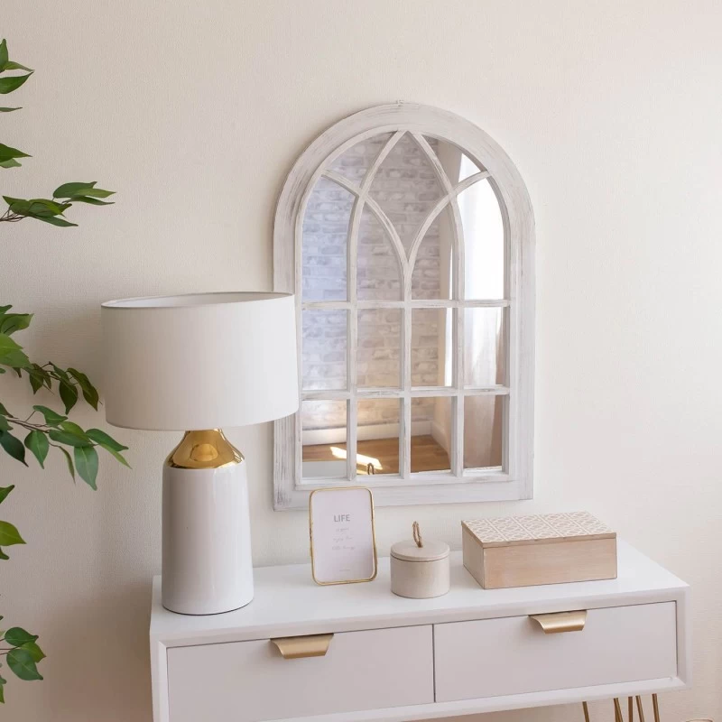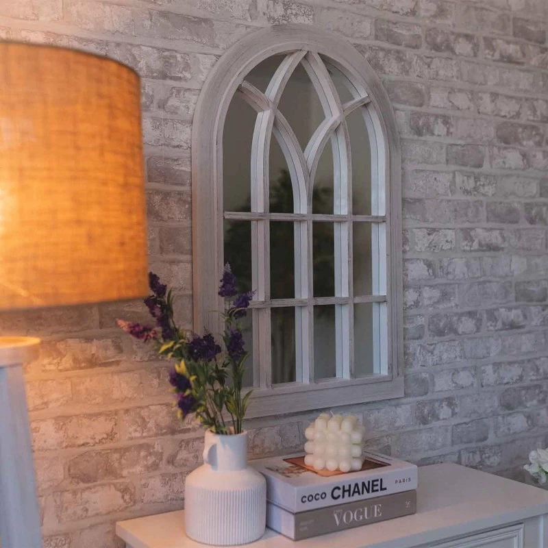 Espejo con forma de ventana de color blanco efecto madera fabricado en plástico de 50cm de ancho y 76cm de altura. Que los espejos ventana son tendencia es una realidad. Aportan amplitud a tu estancia y decoran de una manera más especial que un espejo redondo convencional. Nos encanta su forma y por ello…¡Seguimos ampliando modelos! El espejo Namur, llega para quedarse.