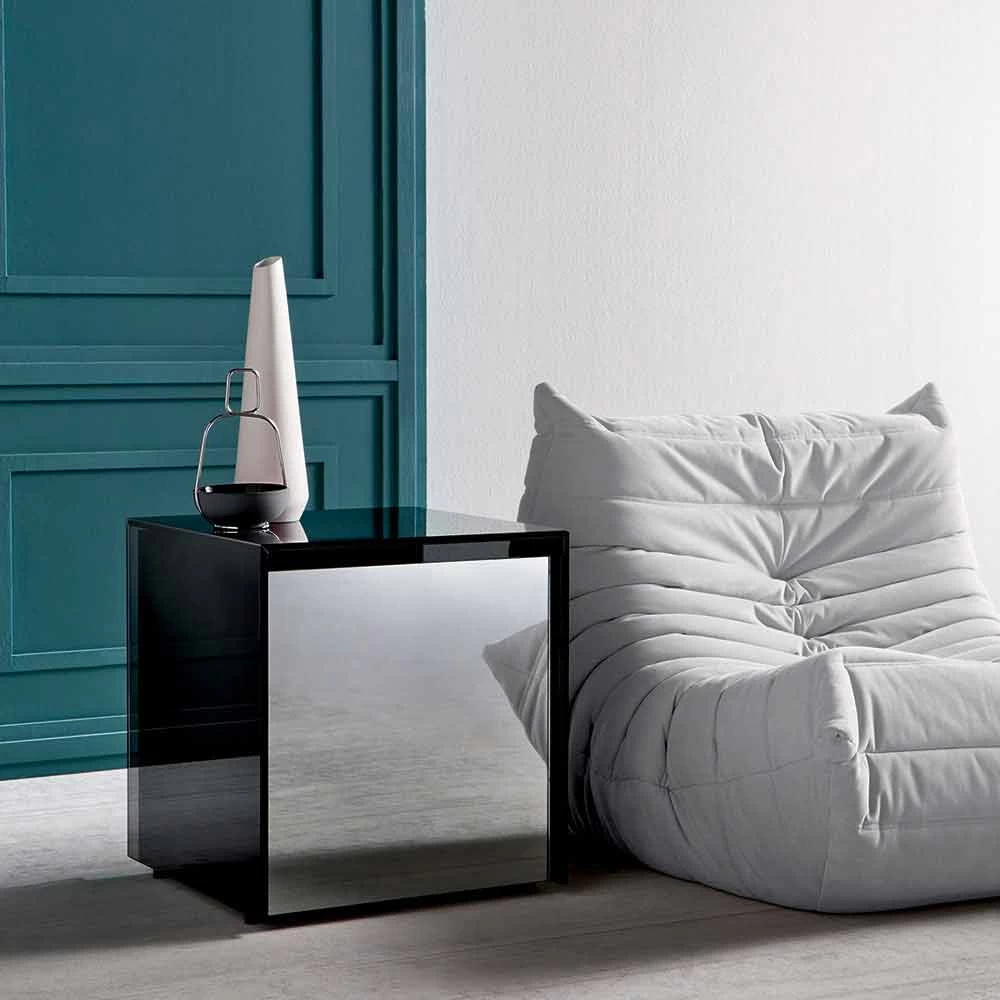 La peculiaridad viene dada por el vidrio ahumado con el que está elaborado, utilizado para la estructura externa, mientras que el efecto «veo no veo» del cajón interno en madera negra crean una construcción refinada y elegante.