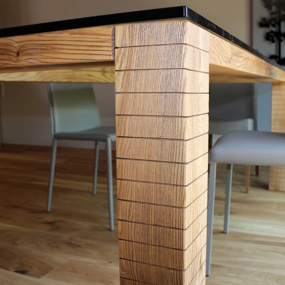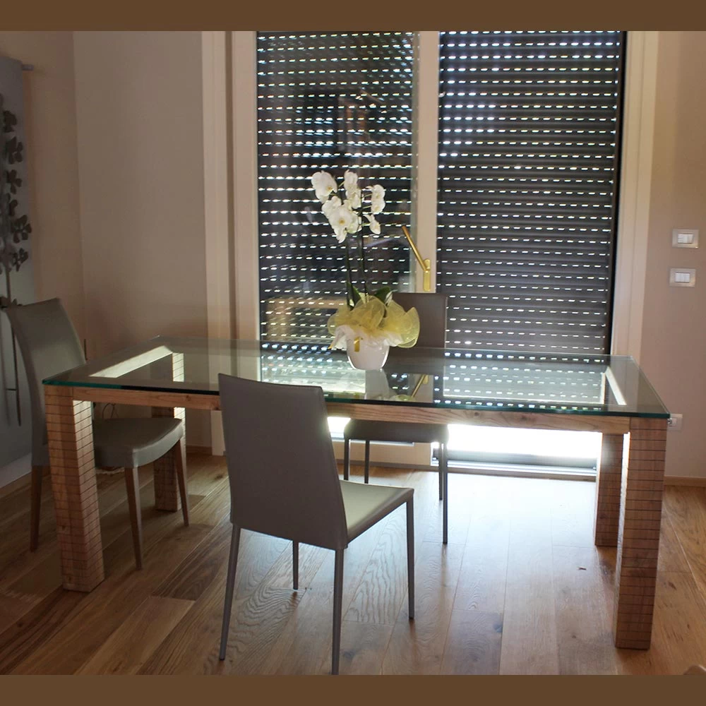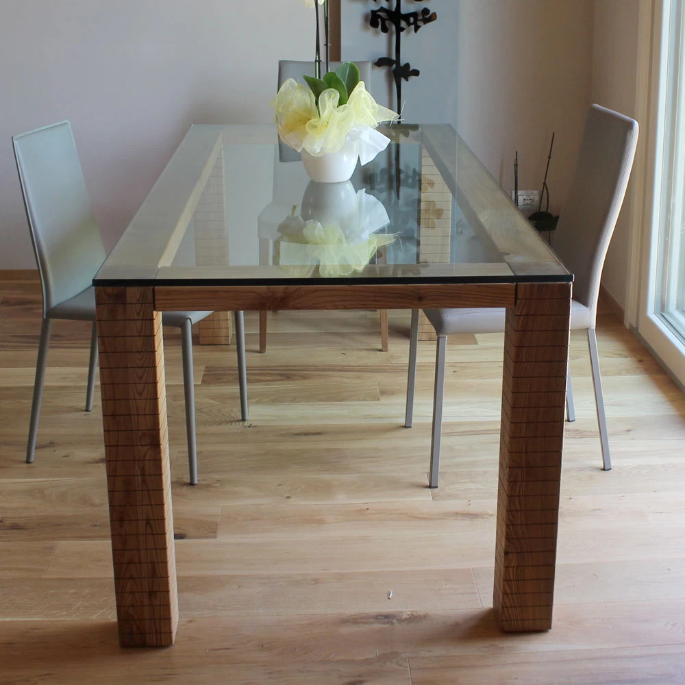 Mesa de comedor en cristal Asella y madera de fresno, hecha a mano en Italia.