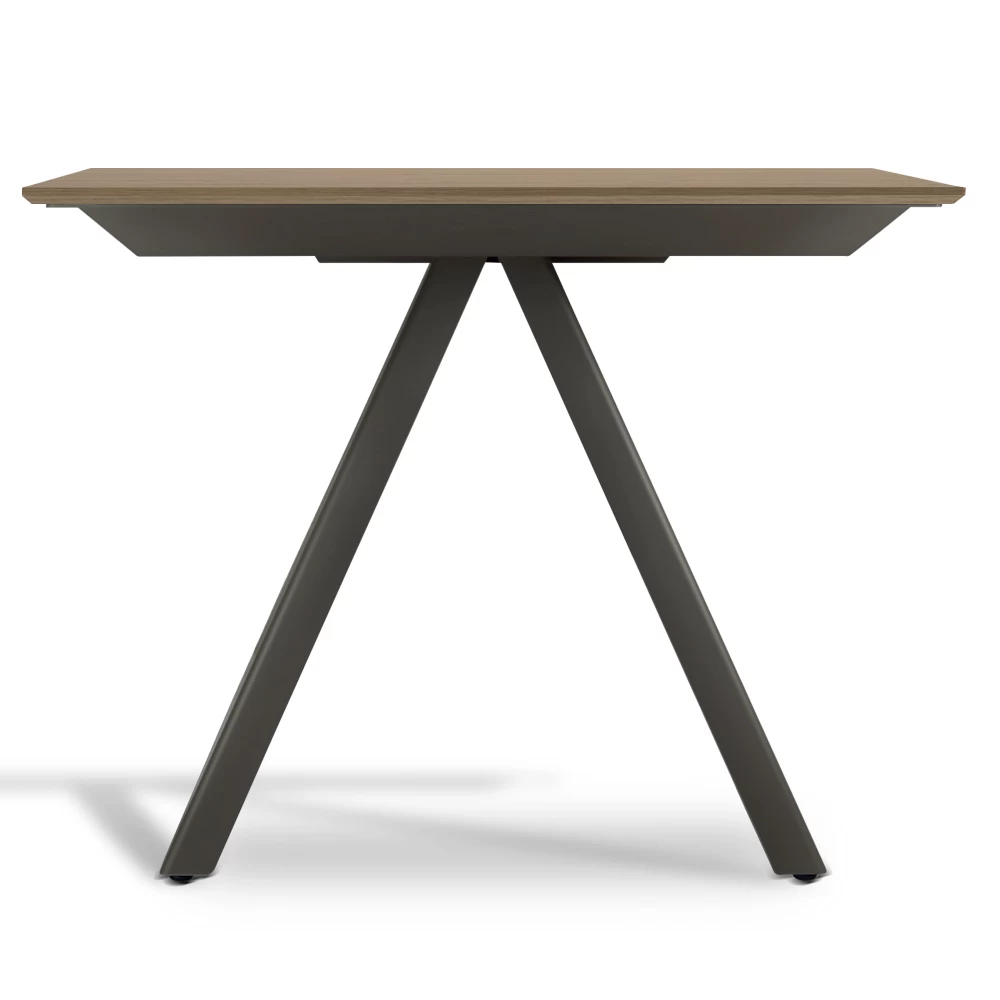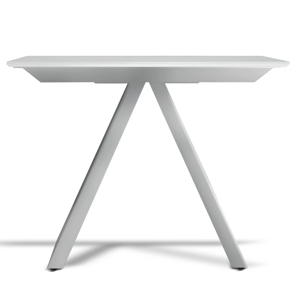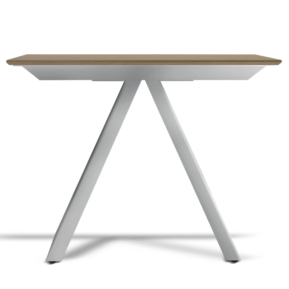 Caracterizado por una tapa de madera laminada (grosor 20 mm) y una base de acero lacado en blanco, gris tórtola o negro.