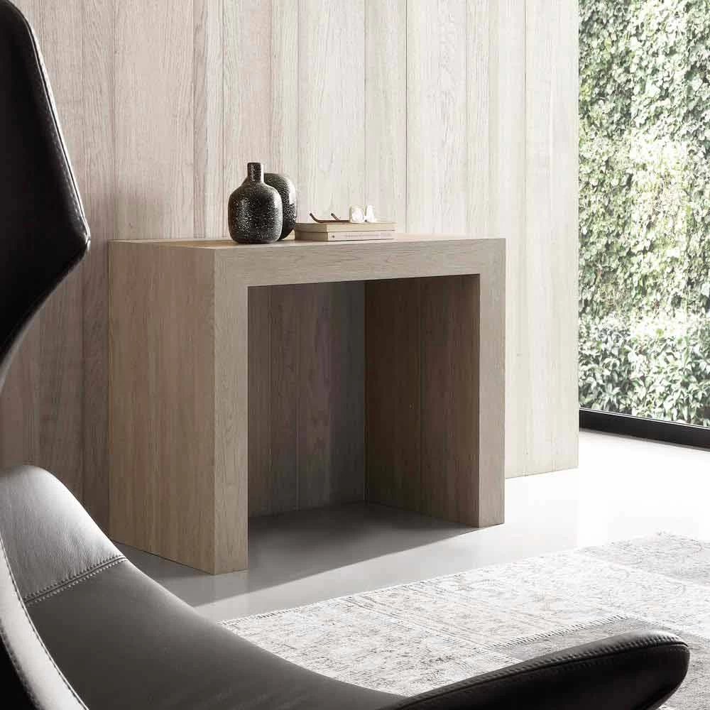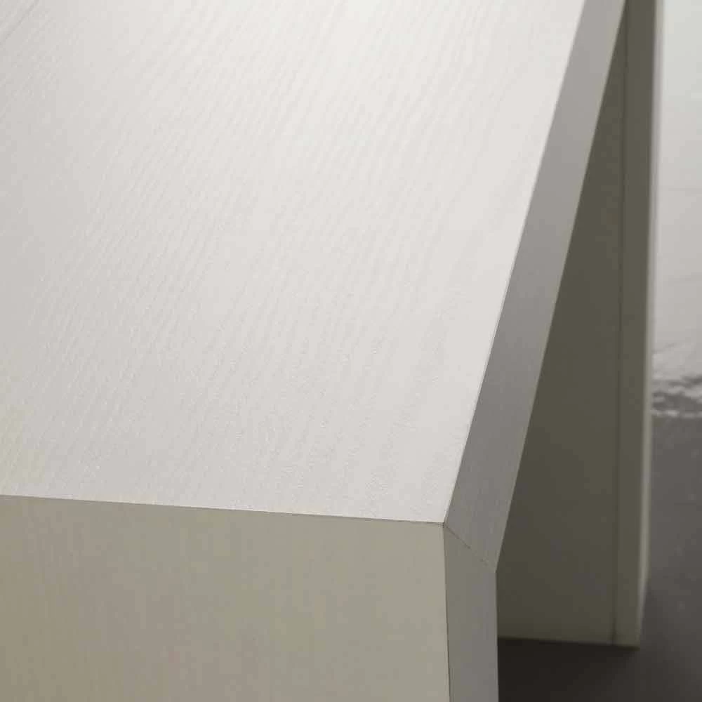 Uri está fabricado en panel de melamina, disponible en los acabados roble nudoso, roble tiza y blanco poro abierto. Las extensiones deben almacenarse fuera de la mesa de la consola.