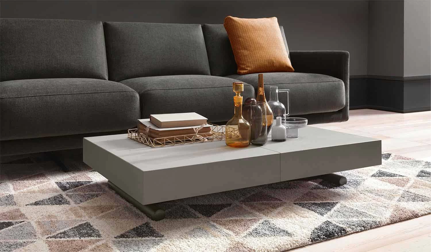 Esta mesa de centro transformable se caracteriza por líneas refinadas y minimalistas capaces de decorar sus ambientes domésticos y contract con elegancia y practicidad.