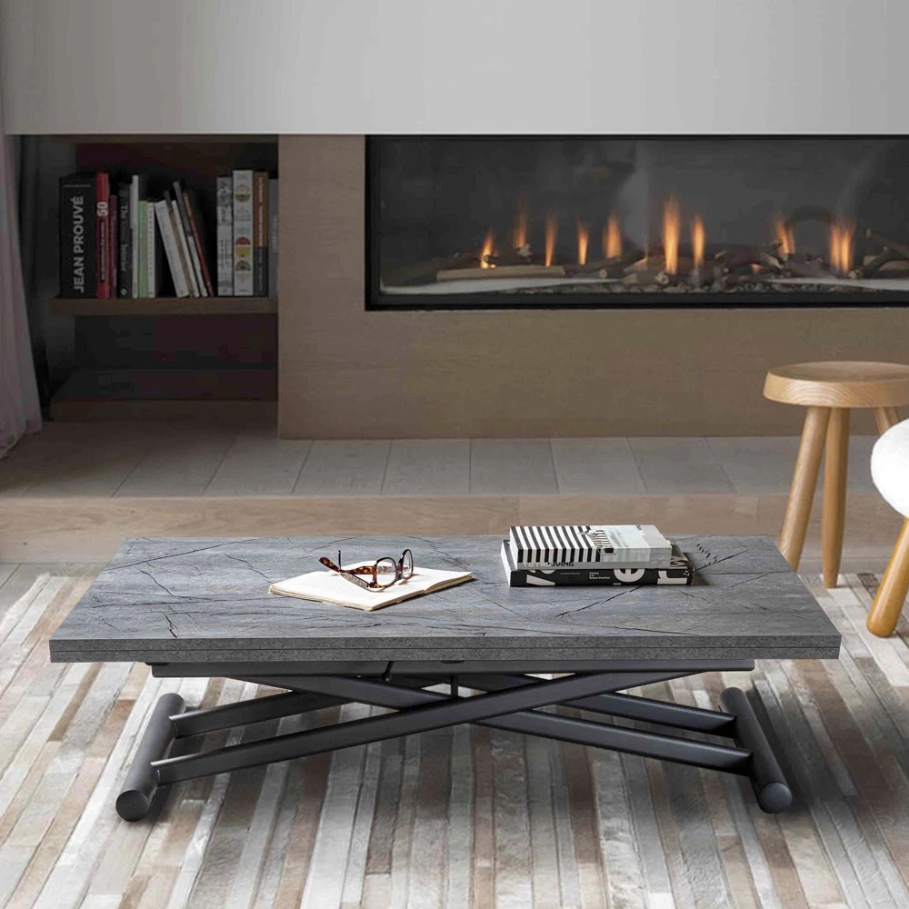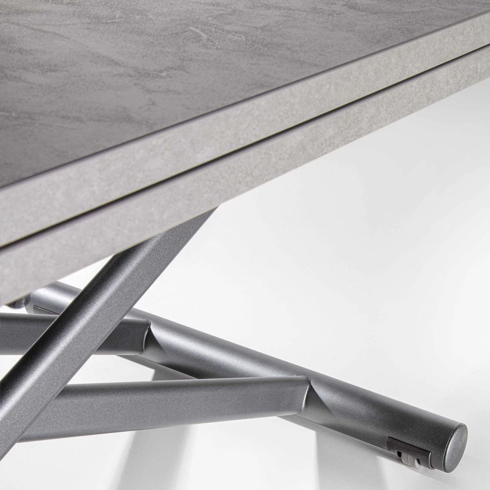Mesa de centro con tapa de melamina y base de metal acabado antracita. La peculiaridad de esta mesa de centro única e innovadora es su estructura que permite transformarla rápida y fácilmente en una práctica mesa de comedor. Esta característica maximiza su funcionalidad, permitiendo así obtener dos artículos en uno y al mismo tiempo optimizar los espacios gracias al pequeño tamaño de la mesa una vez cerrada. De esta forma es posible obtener una superficie de apoyo multifuncional, ideal tanto para almuerzos y cenas con amigos como para bebidas, revistas, libros, etc. dentro de tu salón. Su diseño está perfilado por características refinadas y mínimas capaces de amueblar los ambientes de su hogar con elegancia y practicidad , atrayendo toda la atención sobre sí mismo.