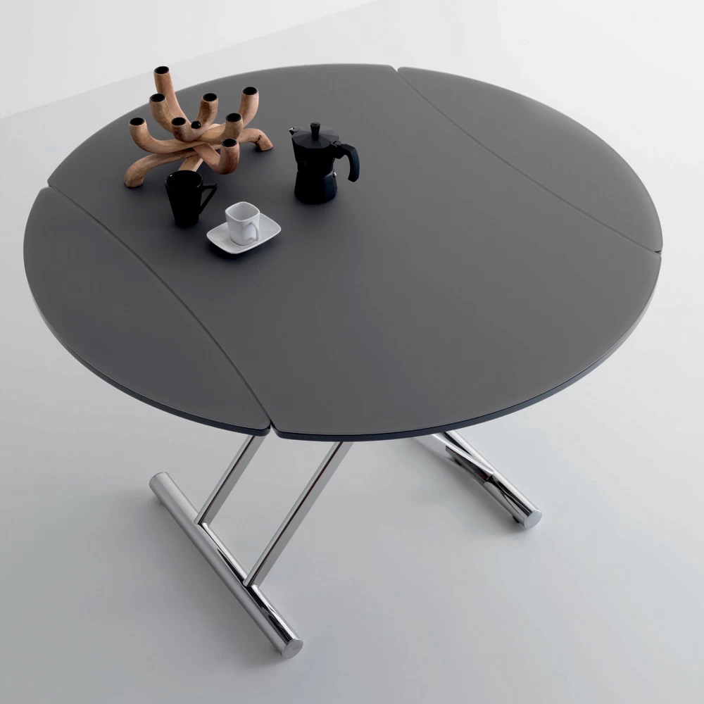 Esta mesa de centro se convierte en mesa de comedor mediante un mecanismo de gas. tiene una base de metal cromado pulido con ruedas retráctiles y una tapa irregular que se puede transformar en una redonda de vidrio grabado en el panel.