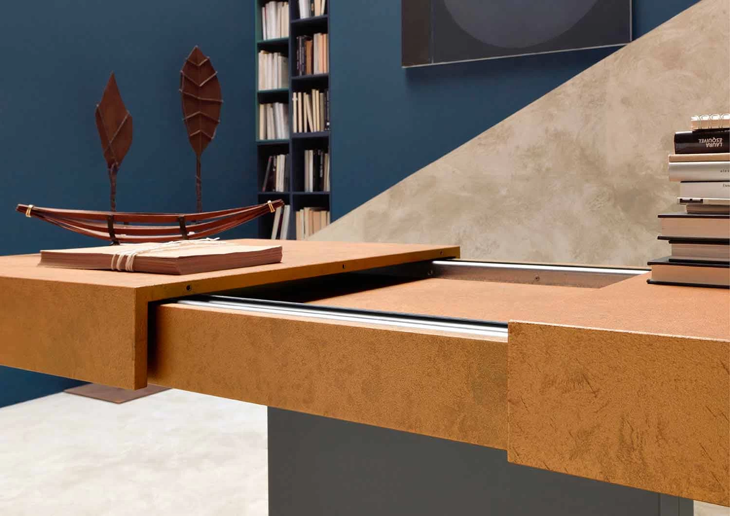 Mesita de diseño transformable con tapa efecto mortero y base de acero Made in Italy.