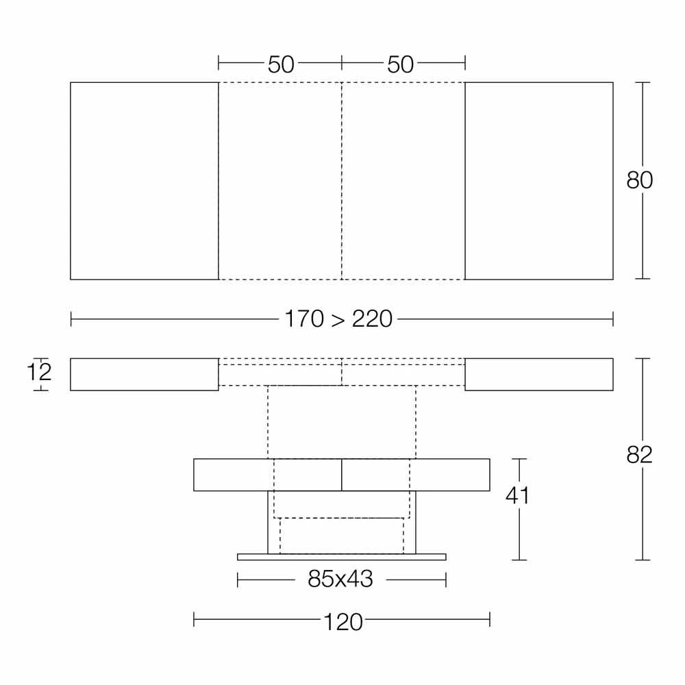 La tapa es rectangular y extensible a través de dos extensiones (internas) de 50 cm cada una y es capaz de transformarse en una mesa de comedor gracias al mecanismo de gas que ajusta la altura al milímetro: de 41 cm a 82 cm.