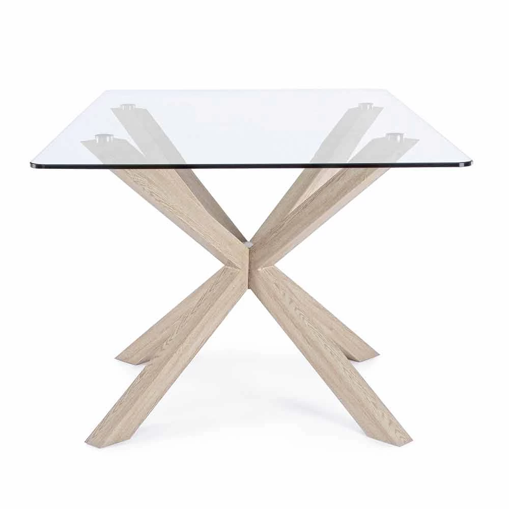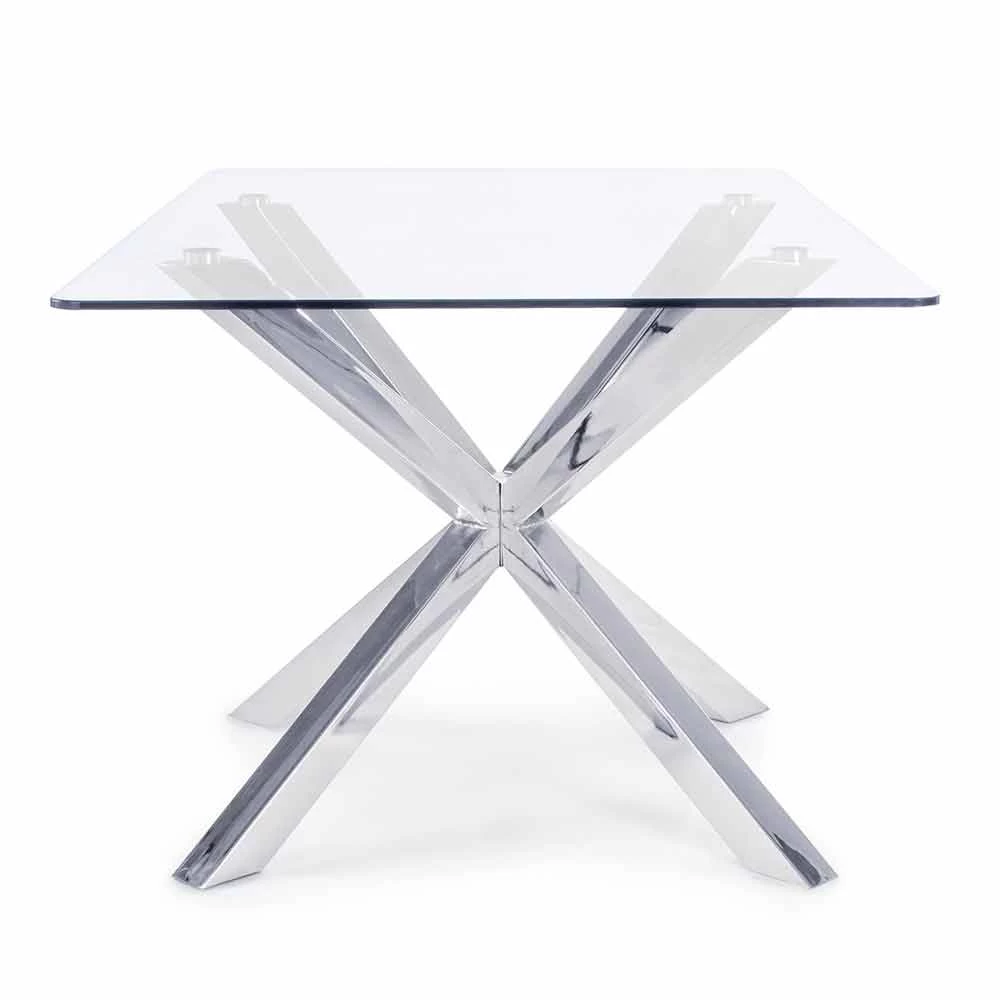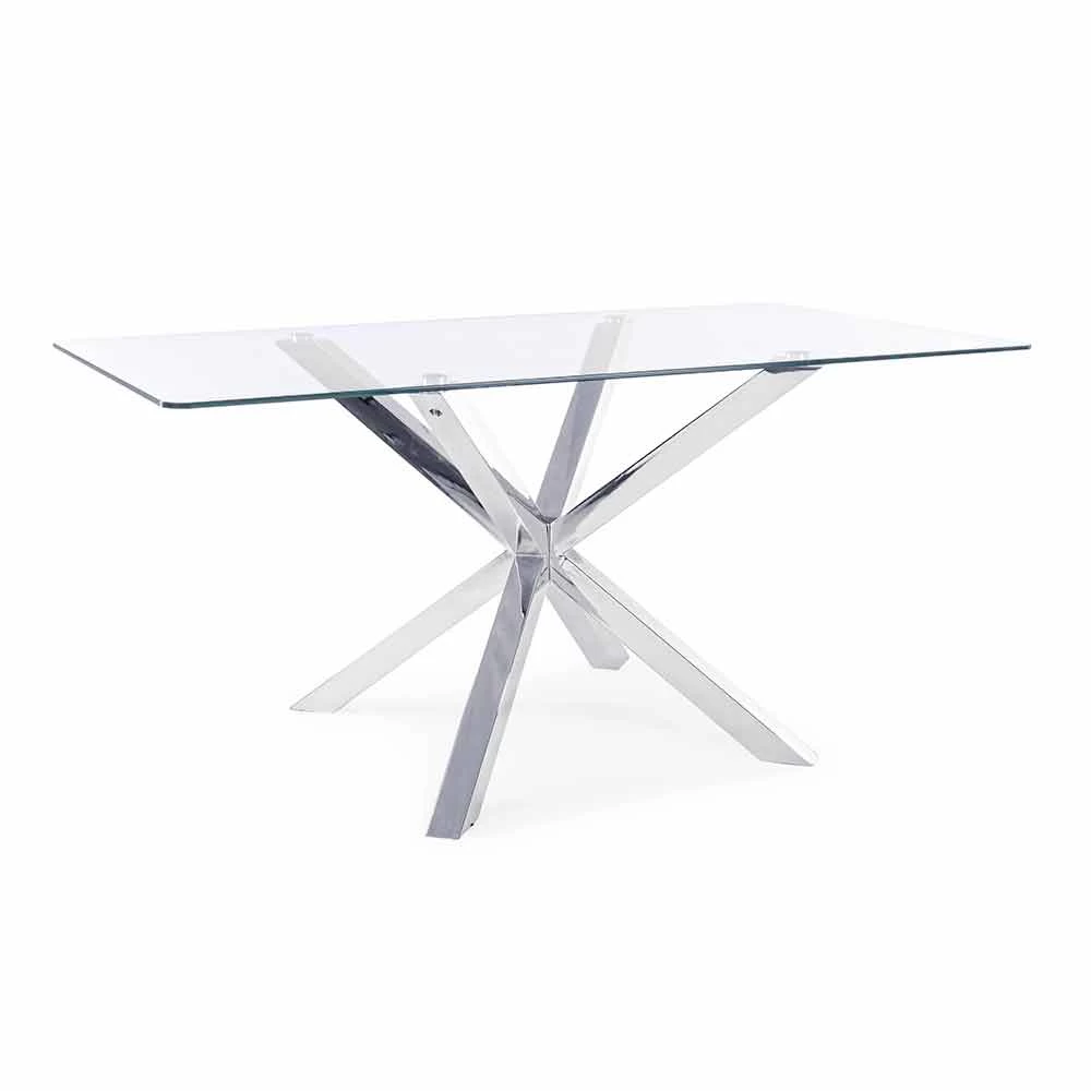 Mesa de comedor moderna con tapa de cristal templado y patas de acero.