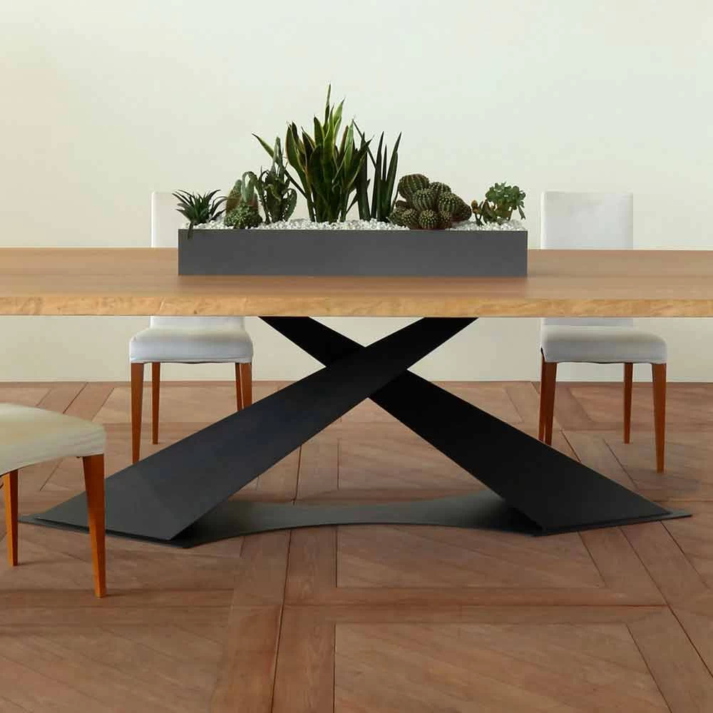 La mesa Elliot se caracteriza por una tapa de roble macizo cepillado con borde de corteza, pintado con un efecto natural y pintura a base de agua antiarañazos, con la particularidad de proporcionar un extraordinario efecto de mesa sin el riesgo de deformación y agrietamiento inherentes a la madera maciza y al soporte metal central, con elementos inclinados y cruzados asimétricamente.