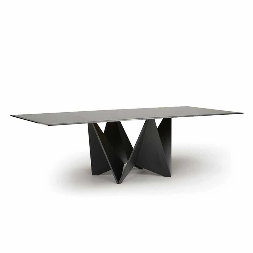 Mesa de comedor de diseño en vidrio ahumado y metal lacado, producto Made in Italy de alta calidad.