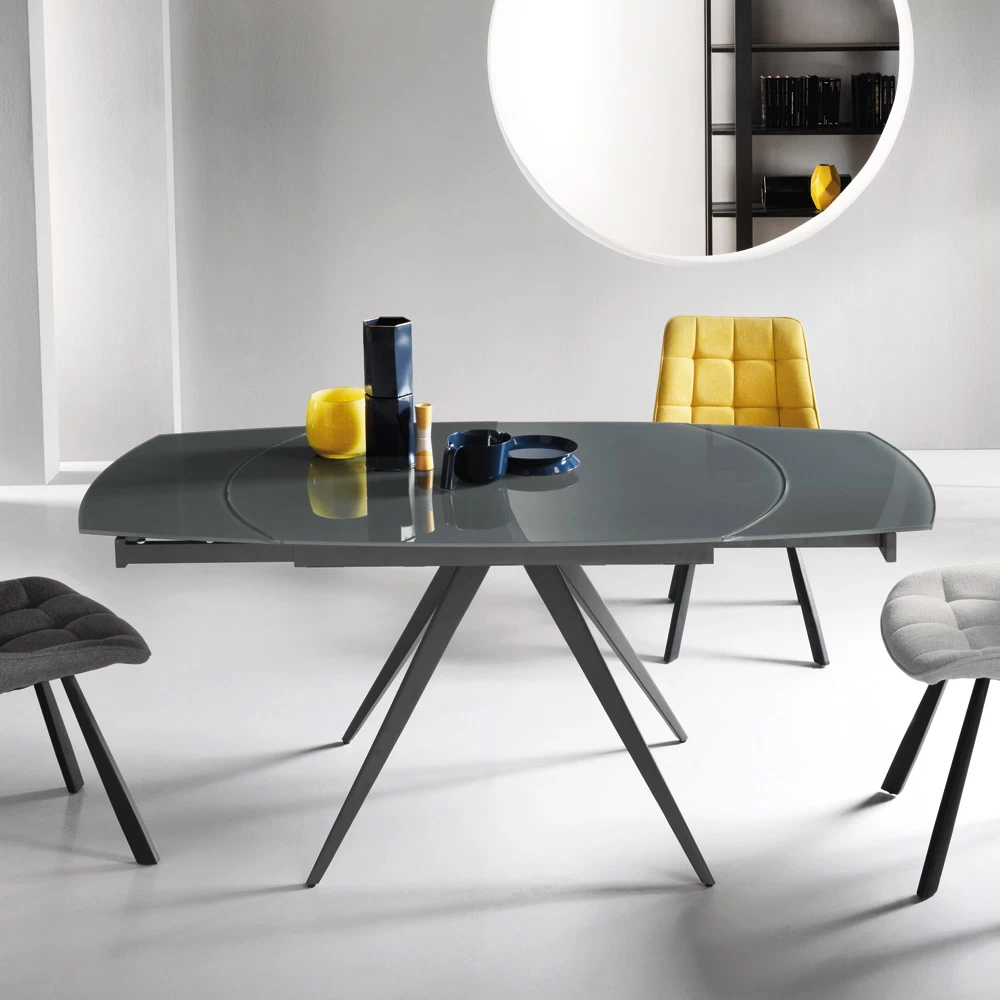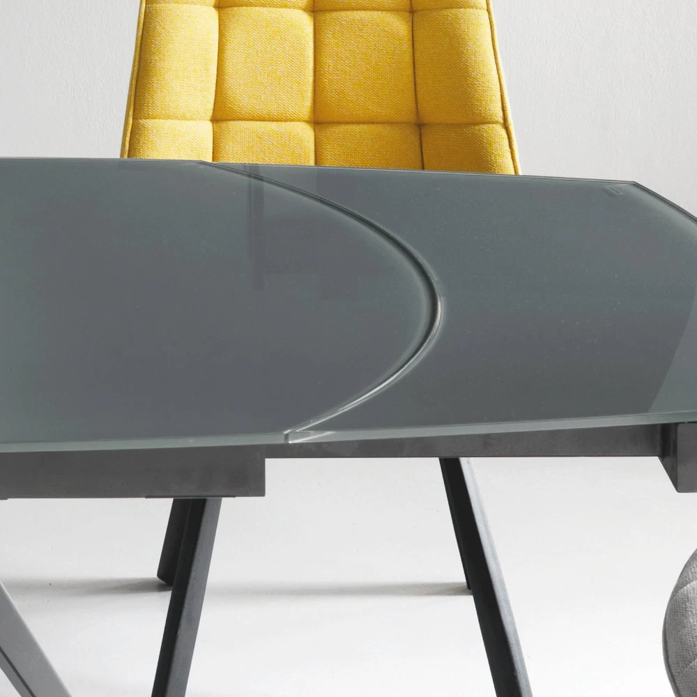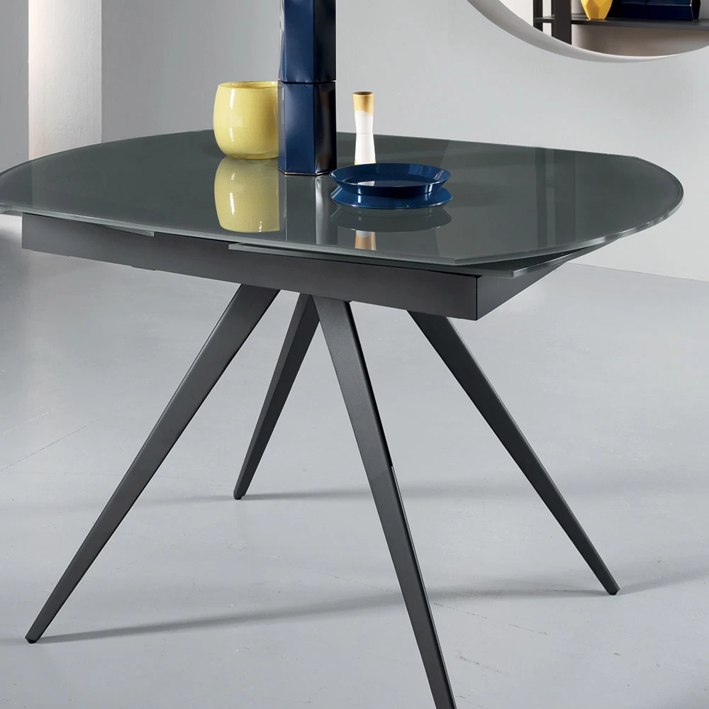 Mesa de comedor extensible en cristal antracita y metal pintado.