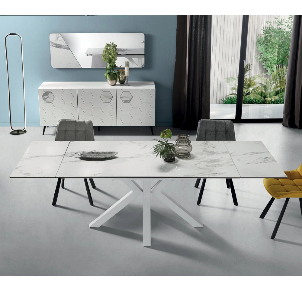 Mesa de comedor extensible con sobre de gres porcelánico efecto mármol y base de metal pintado de líneas sencillas y modernas, capaz de dar carácter a tu ambiente. Equipado con 2 extensiones laterales de 40 cm y un mecanismo giratorio que permite extender el tablero de forma rápida y sencilla para un resultado funcional y especialmente original .