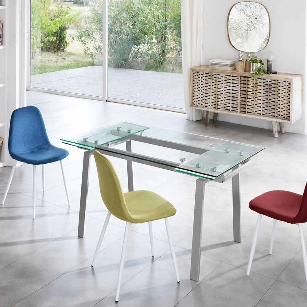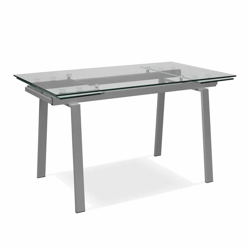 Mesa extensible de diseño con base de metal pintado. Tapa y extensiones en vidrio templado transparente.