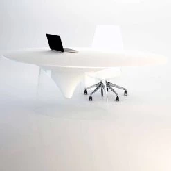 Realizado con una tapa elíptica en Solid Surface® que se desliza dentro de una base de cristal transparente que interpreta un jarrón en el que se coloca la flor.