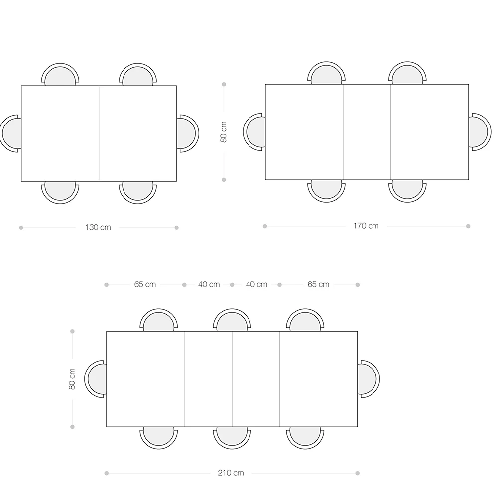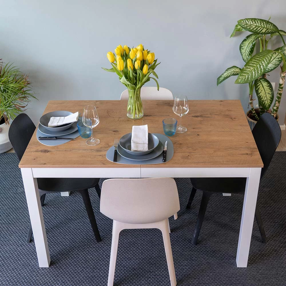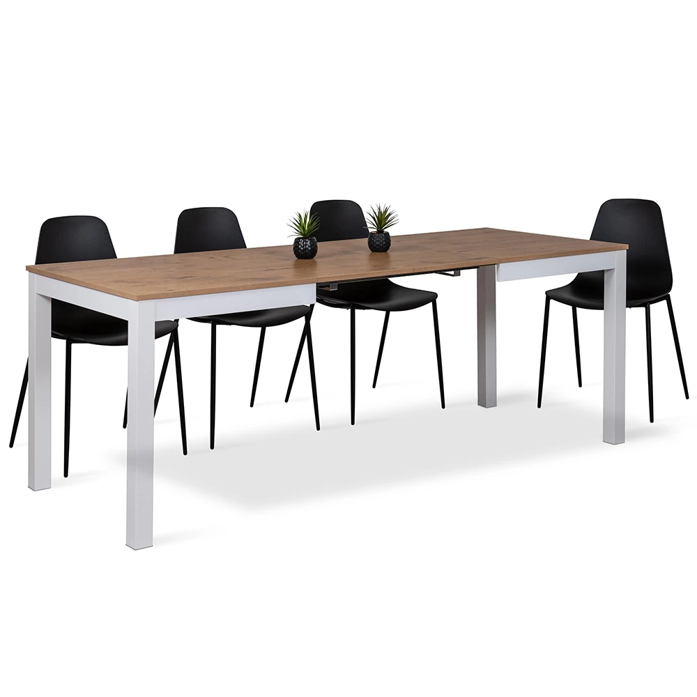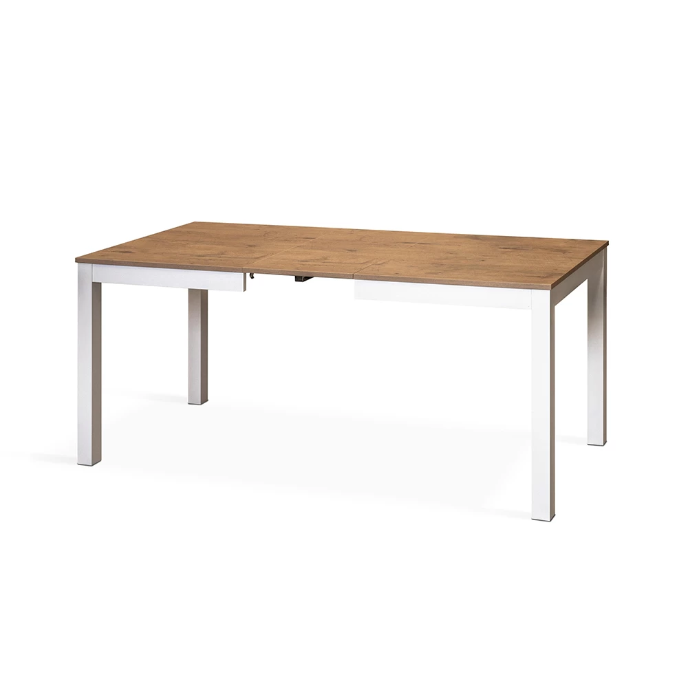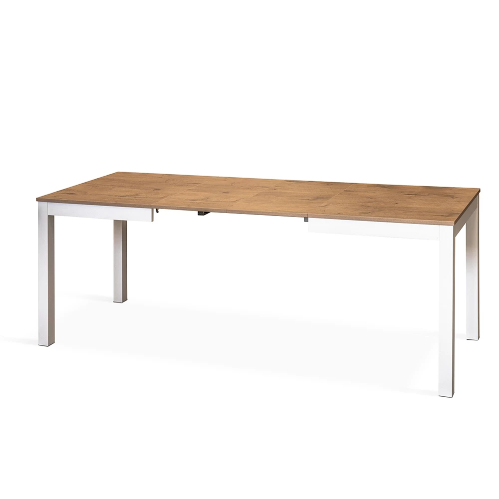 Mesa de comedor con tapa extensible hasta 210 cm (dos extensiones de 40 cm) en melamina imitación roble mate con interior de MDF y estructura en madera maciza de haya pintada en blanco mate con polvo epoxi horneado, íntegramente fabricada en Italia . La sólida estructura, la superficie de gran resistencia y los acabados son las principales características de esta mesa extensible, moderna y de atractivo diseño. Las extensiones se pueden colocar en la parte central de la tapa, siempre garantizando el posicionamiento externo de las patas incluso cuando la mesa está extendida. Esto asegura un asiento cómodo y espacioso para todos.
