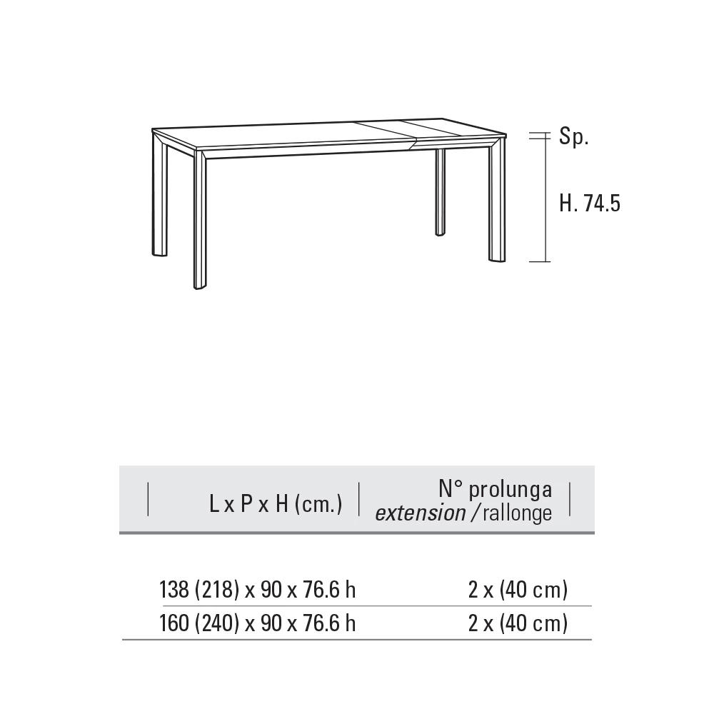 - ancho 138/218 x profundidad 90 x altura 76,5 cm;