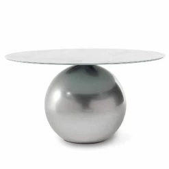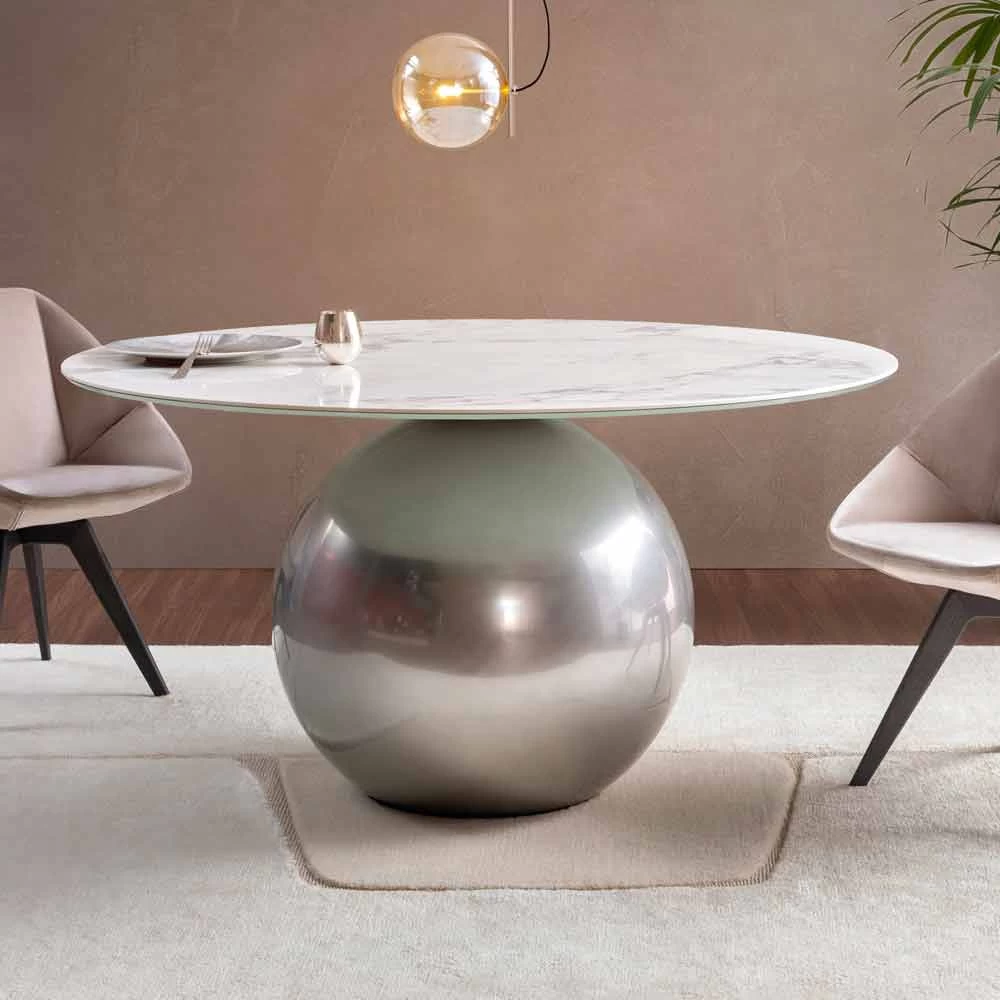Esta mesa de comedor redonda está fabricada en Italia con materias primas de alta calidad y se caracteriza por un diseño sumamente moderno e innovador donde el elemento que llama la atención de inmediato es sin duda la base redonda en metal con acabado cromado nublado que le da elegancia al producto. y singularidad, mientras que la tapa es de cerámica disponible en 4 variantes.