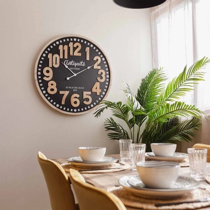 Reloj de pared fabricado en mdf disponible en dos colores diferentes a elegir de 80cm. Un complemento ideal para vestir tus paredes de estilo retrovintage. Elige tu modelo favorito y nunca llegues tarde.