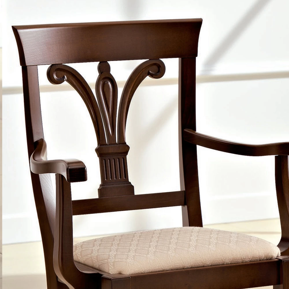 Esta silla de salón está completamente fabricada en Italia con estructura de madera de haya con reposabrazos disponibles en varios acabados con una decoración particular en el respaldo y el asiento en tela.