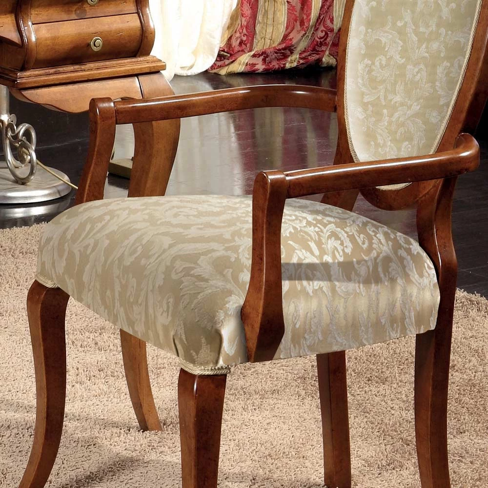 Silla de comedor de estilo clásico fabricada en madera acabado nogal y tapizada en tela disponible en la versión con o sin reposabrazos.