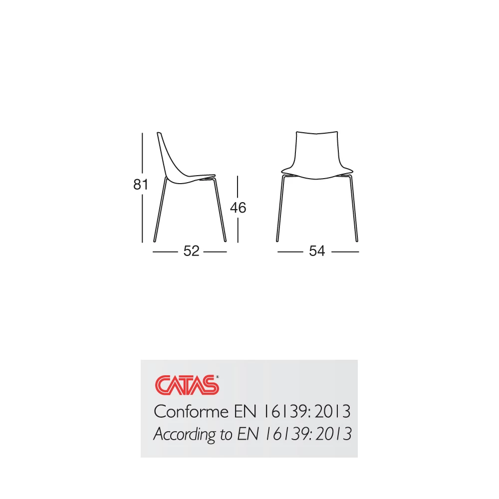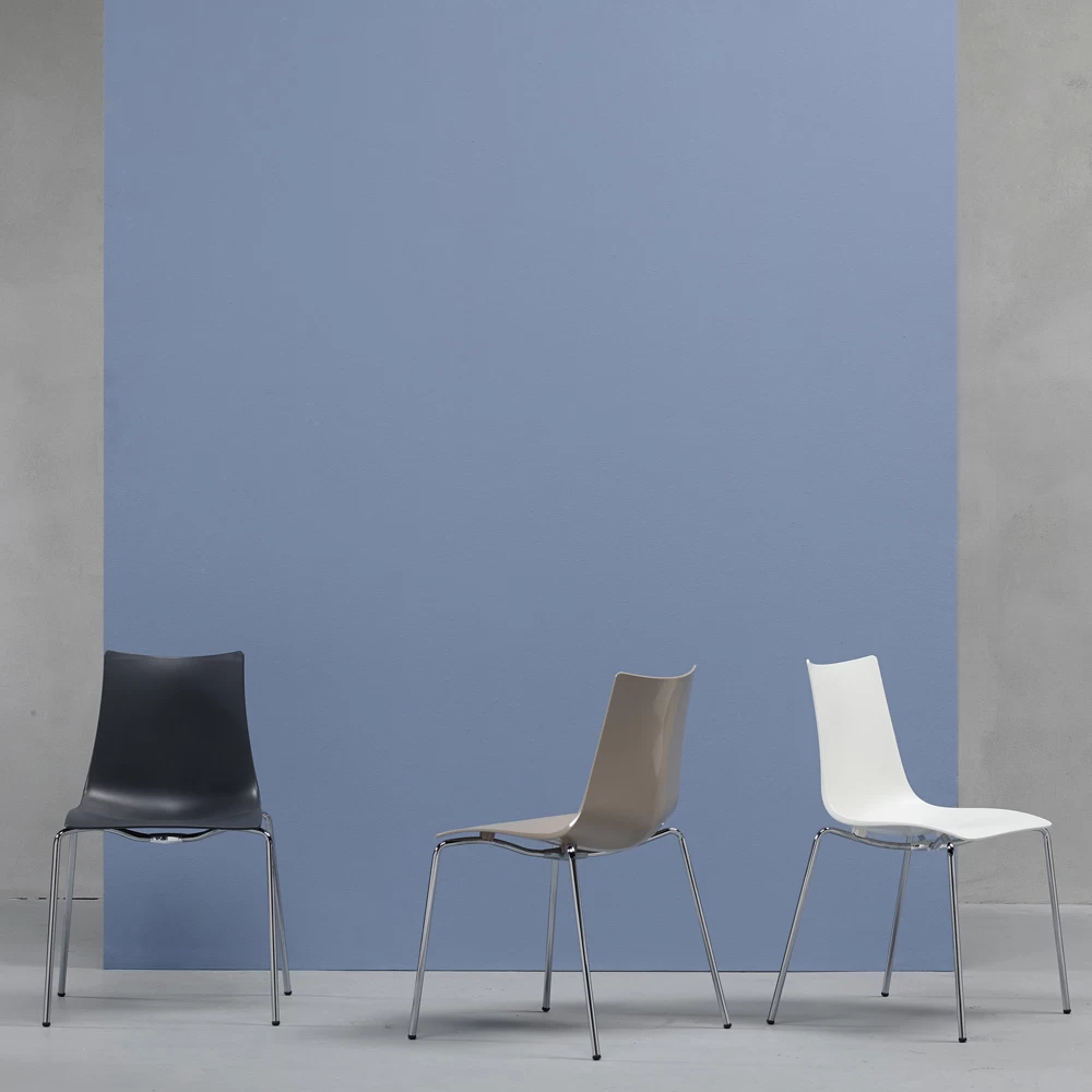 Disponibles con un marco de 4 patas, son perfectos para uso en interiores. Se presta a amueblar con estilo y sobriedad gracias a una rica y refinada variedad cromática. Apilable hasta ocho elementos.