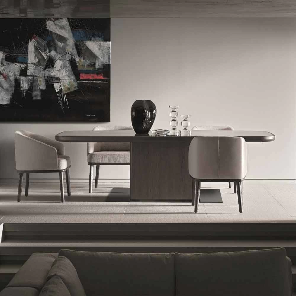 Este maravilloso mueble se caracteriza por una elegancia sobria y atemporal que encaja a la perfección con las formas suaves y redondeadas del cuerpo, que ofrece comodidad, un diseño ergonómico y una excelente versatilidad de uso dando vida así al asiento perfecto para comedores o cocinas. con un gusto contemporáneo. De la combinación de la majestuosidad de la madera, el refinamiento del cuero y el aspecto sobrio de la tela, nace una silla única con una personalidad imponente y estilo exclusivo, ideal para caracterizar cualquier ambiente con un toque de clase.