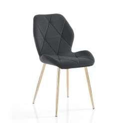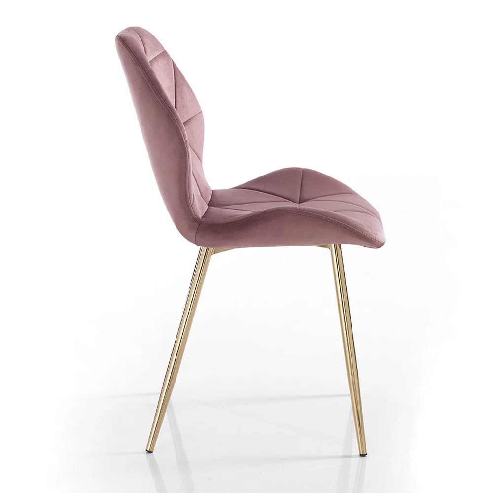 Silla de comedor con patas en metal pintado en oro brillante y asiento tapizado en tejido efecto terciopelo . Un diseño original y contemporáneo ideal para quienes aman decorar sus espacios con personalidad y un toque creativo. La particular textura geométrica que recubre el asiento enriquece aún más su estética mientras que la maravillosa combinación de acabados y materiales subraya su elegancia y alma romántica . Ideal para completar comedores y cocinas modernas pero también espacios contract como bares y restaurantes donde crea un ambiente acogedor y asegura un óptimo confort .