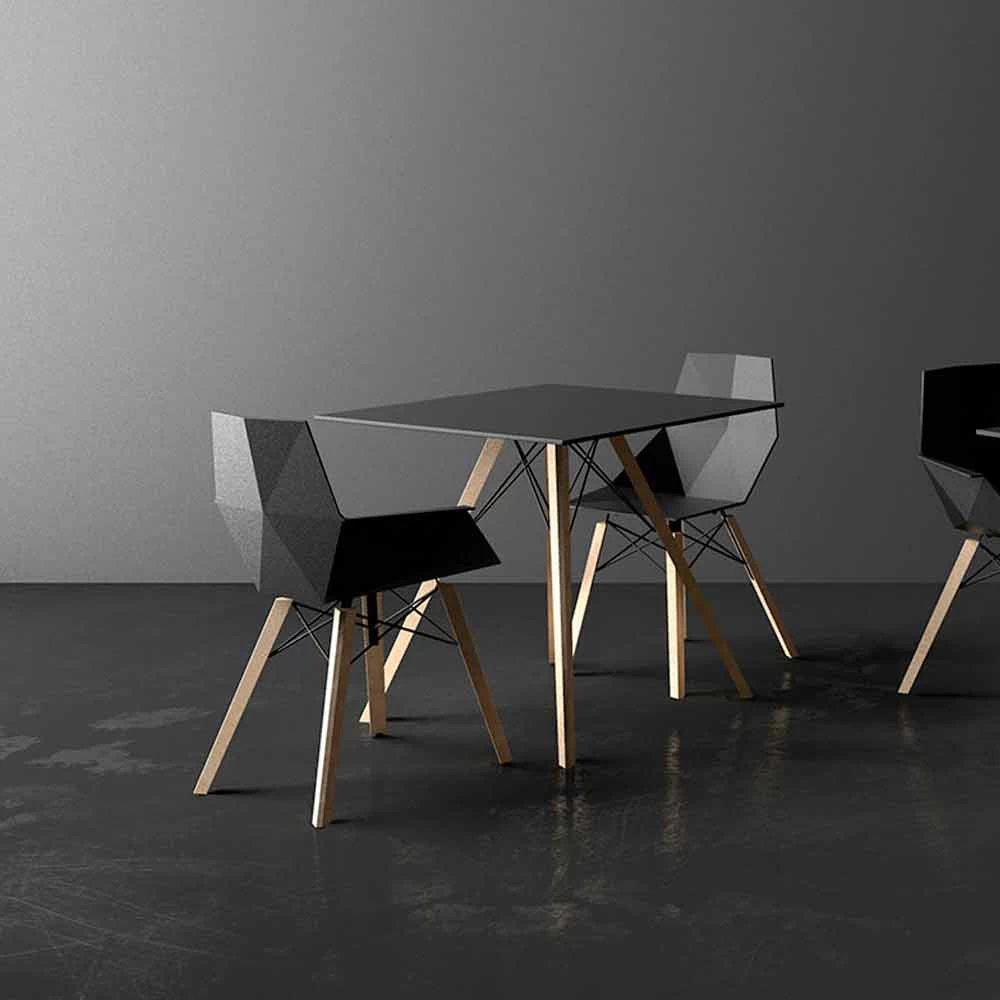 Realizada con una estructura de madera de fresno y asiento y respaldo de polipropileno , esta última permite crear un efecto volumétrico que caracteriza al complemento.