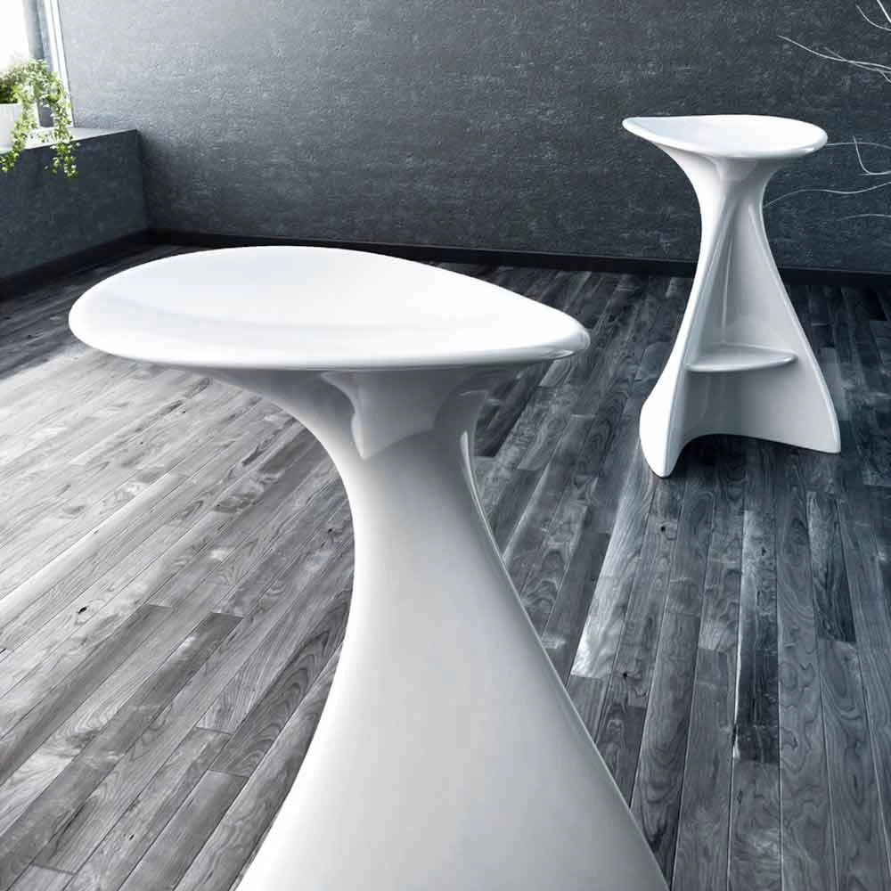 Taburete monolítico fabricado en Solid Surface; caracterizado por un diseño orgánico/biomórfico que recuerda el mundo de la ciencia ficción.
