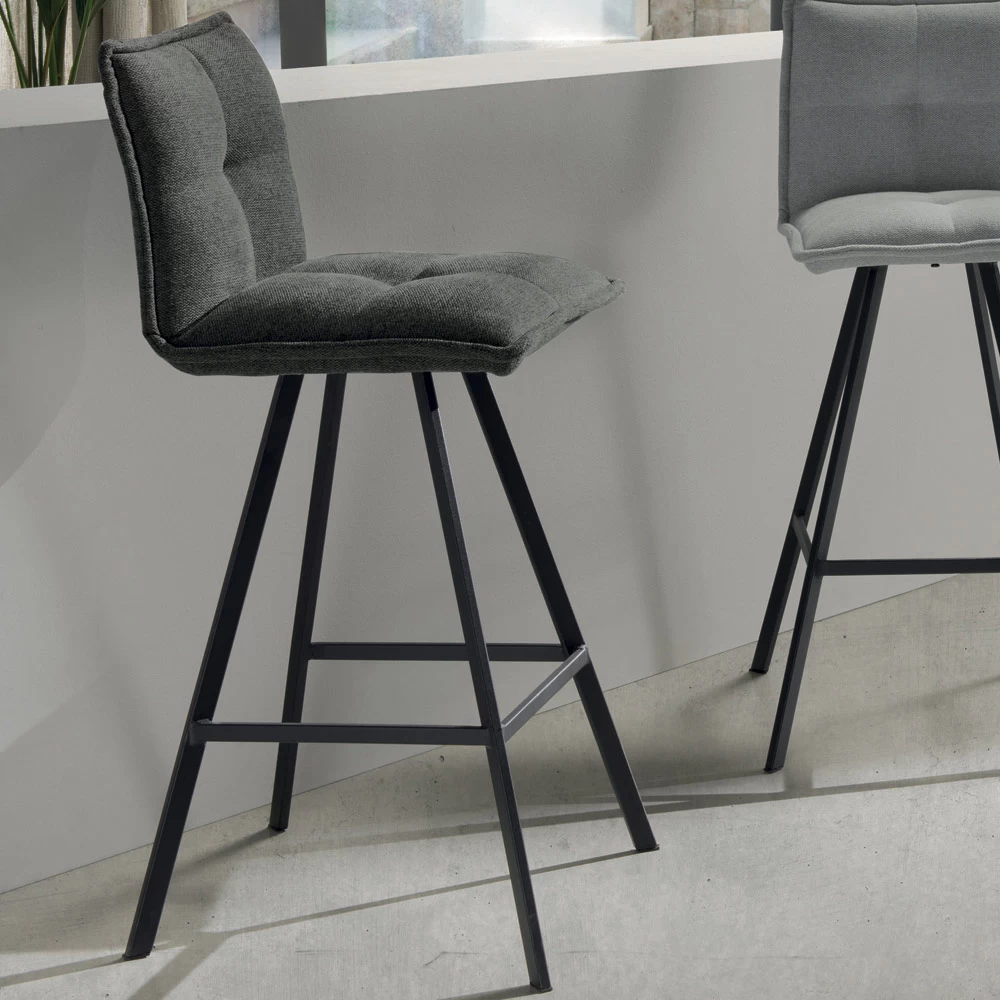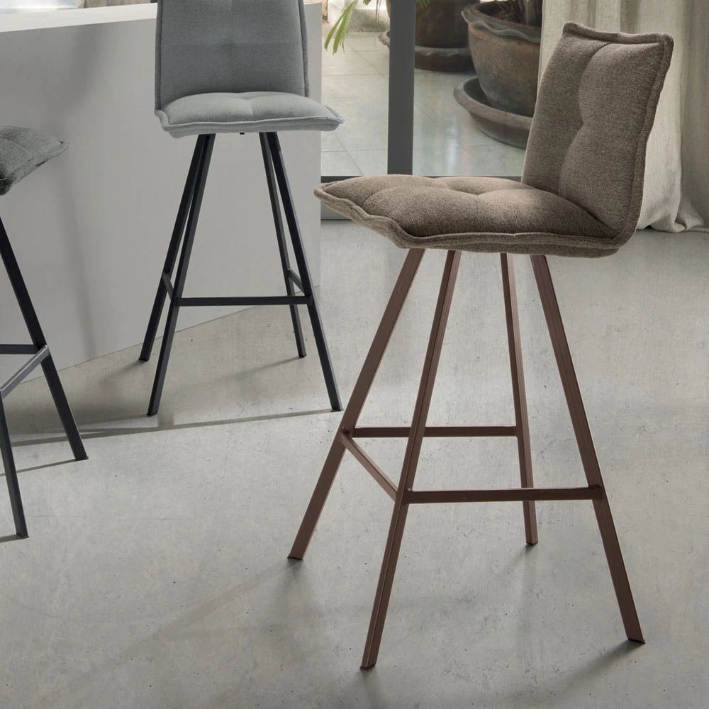 Taburete alto realizado en tejido tapizado con estructura de metal pintado con práctico reposapiés, caracterizado por un diseño moderno, sencillo y elegante. Su asiento es especialmente suave y acogedor, ideal para ofrecer un confort óptimo . Un complemento con un estilo tradicional reinterpretado en clave contemporánea para dar vida a un asiento original mediante el uso de materiales modernos e innovadores .